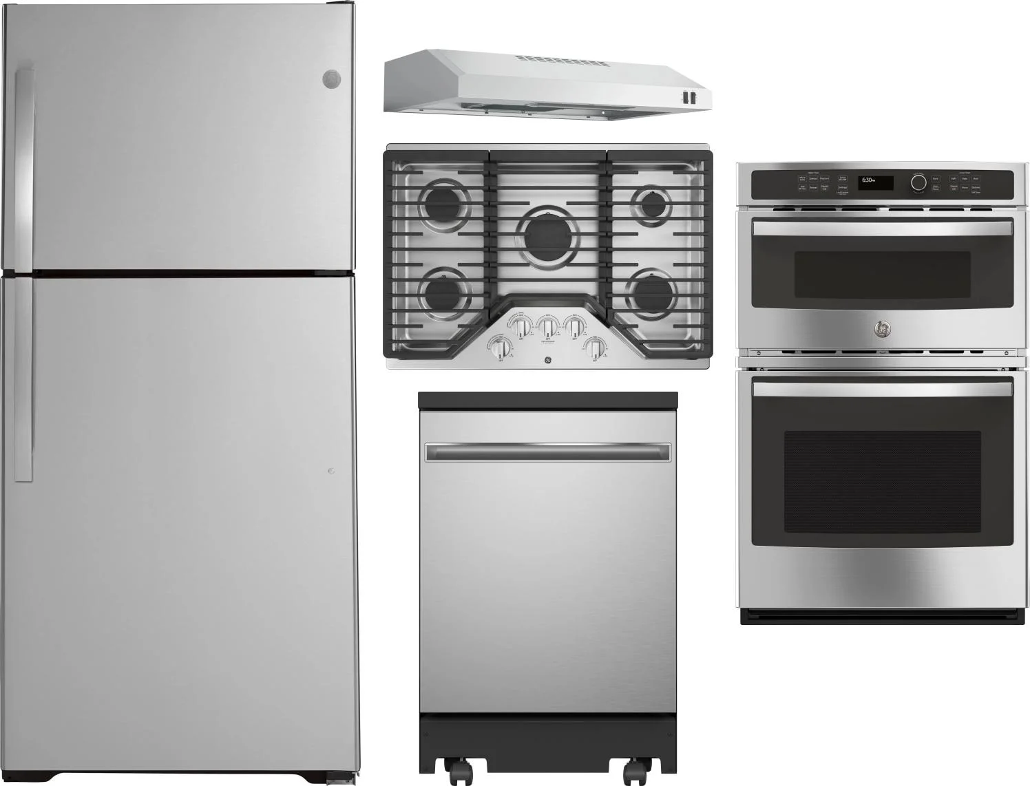 GE 5 Piece Package Includes Refrigerator, Cooktop, Wall Oven, Hood And Dishwasher in Stainless Steel