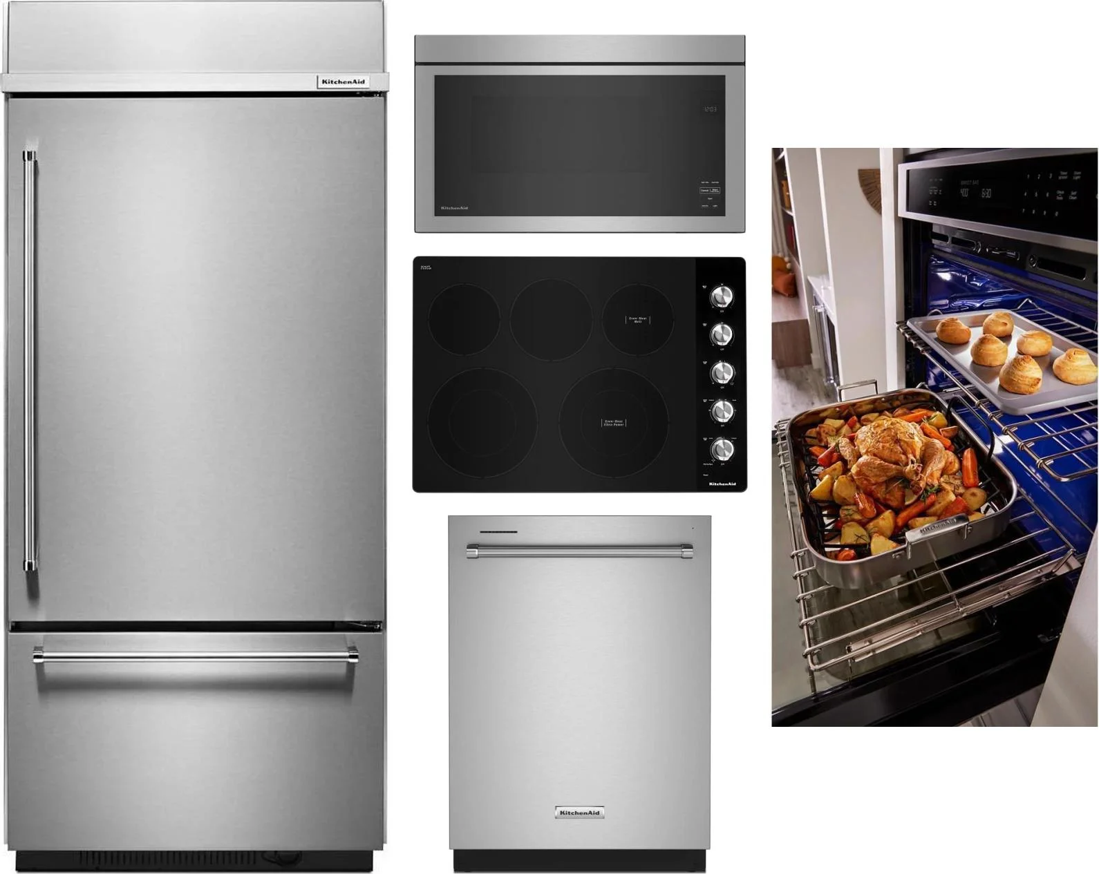 KitchenAid 5 Piece Package Includes Refrigerator, Cooktop, Wall Oven, Microwave And Dishwasher