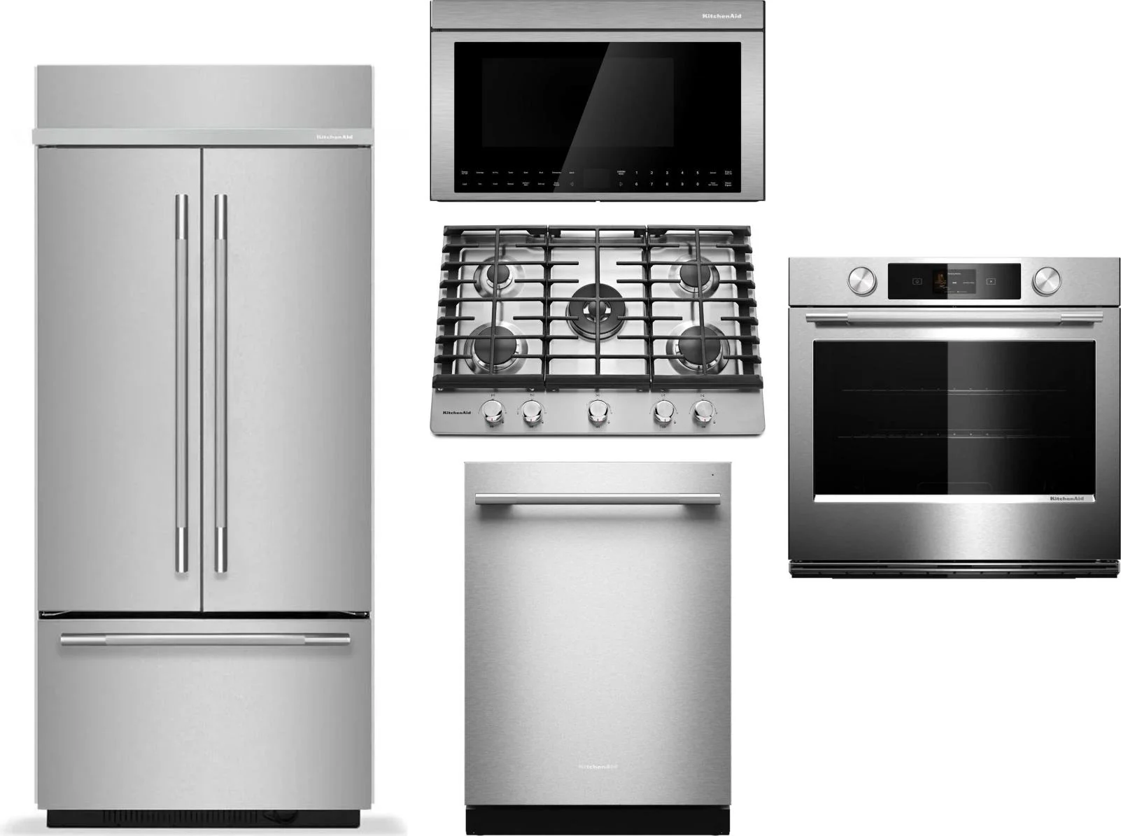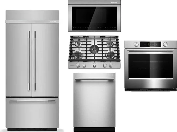 KitchenAid 5 Piece Package Includes Refrigerator, Cooktop, Wall Oven, Microwave And Dishwasher