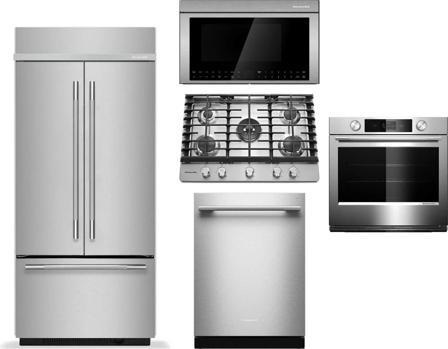 KitchenAid 5 Piece Package Includes Refrigerator, Cooktop, Wall Oven, Microwave And Dishwasher
