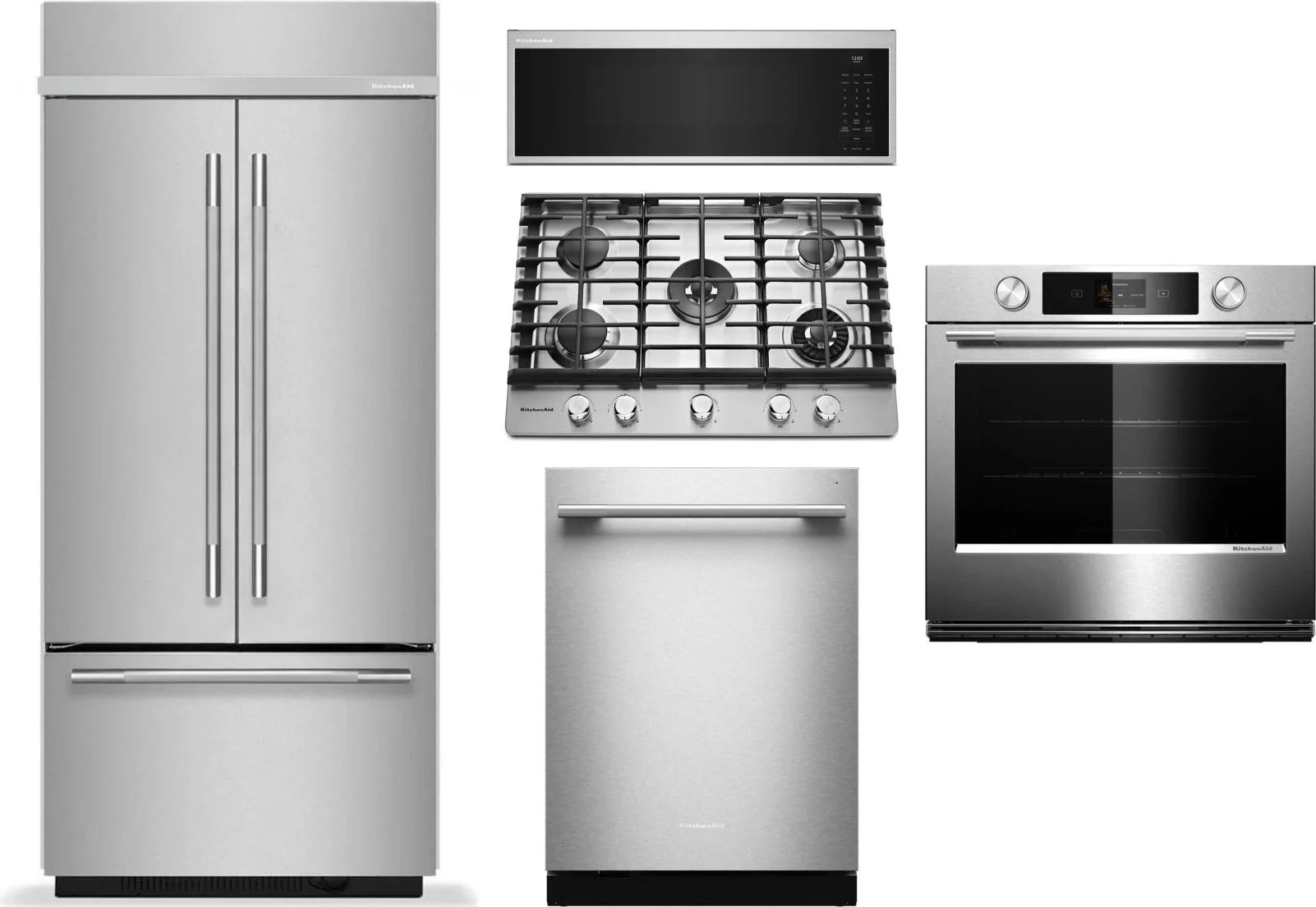KitchenAid 5 Piece Package Includes Refrigerator, Cooktop, Wall Oven, Microwave And Dishwasher