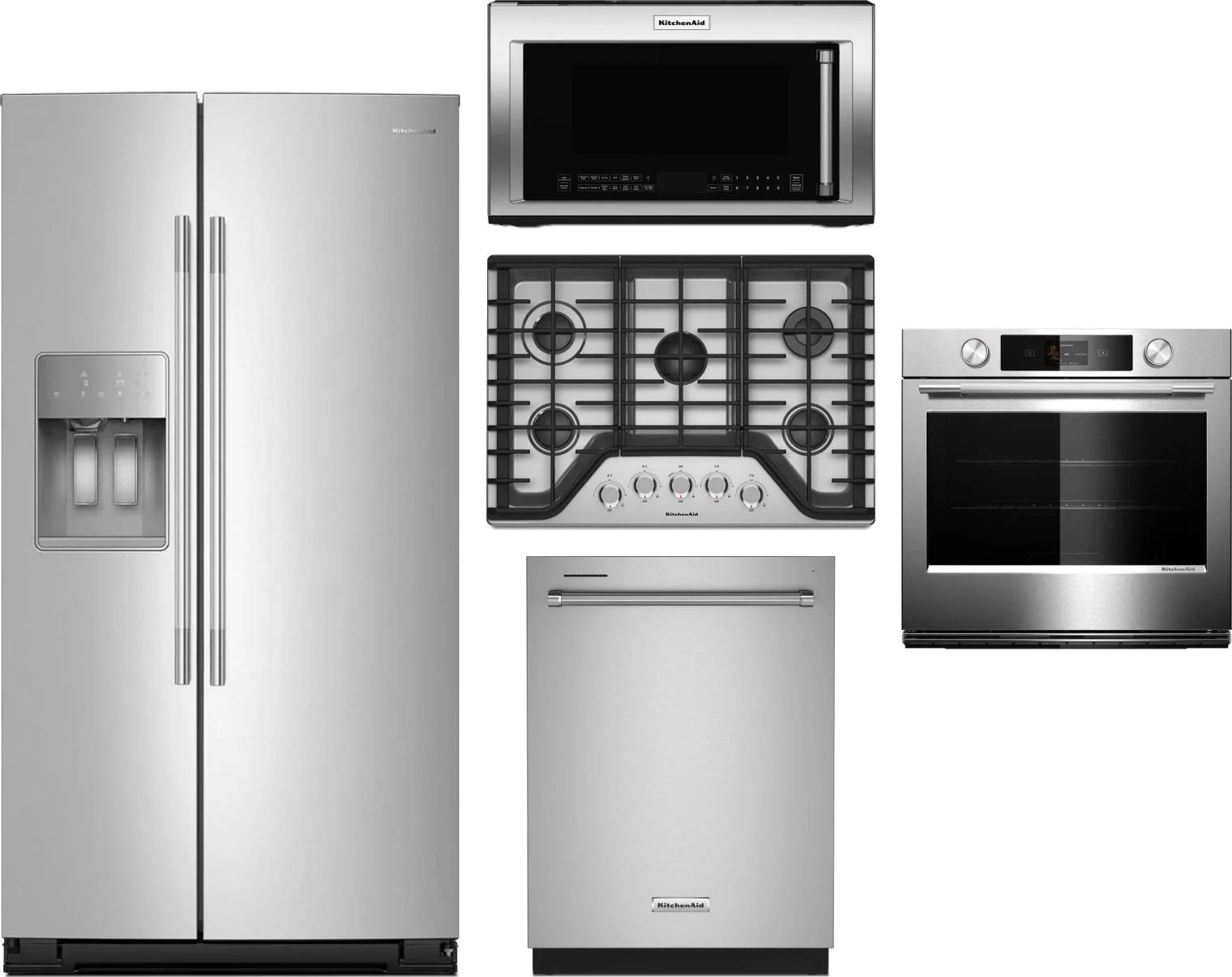 KitchenAid 5 Piece Package Includes Refrigerator, Cooktop, Wall Oven, Microwave And Dishwasher