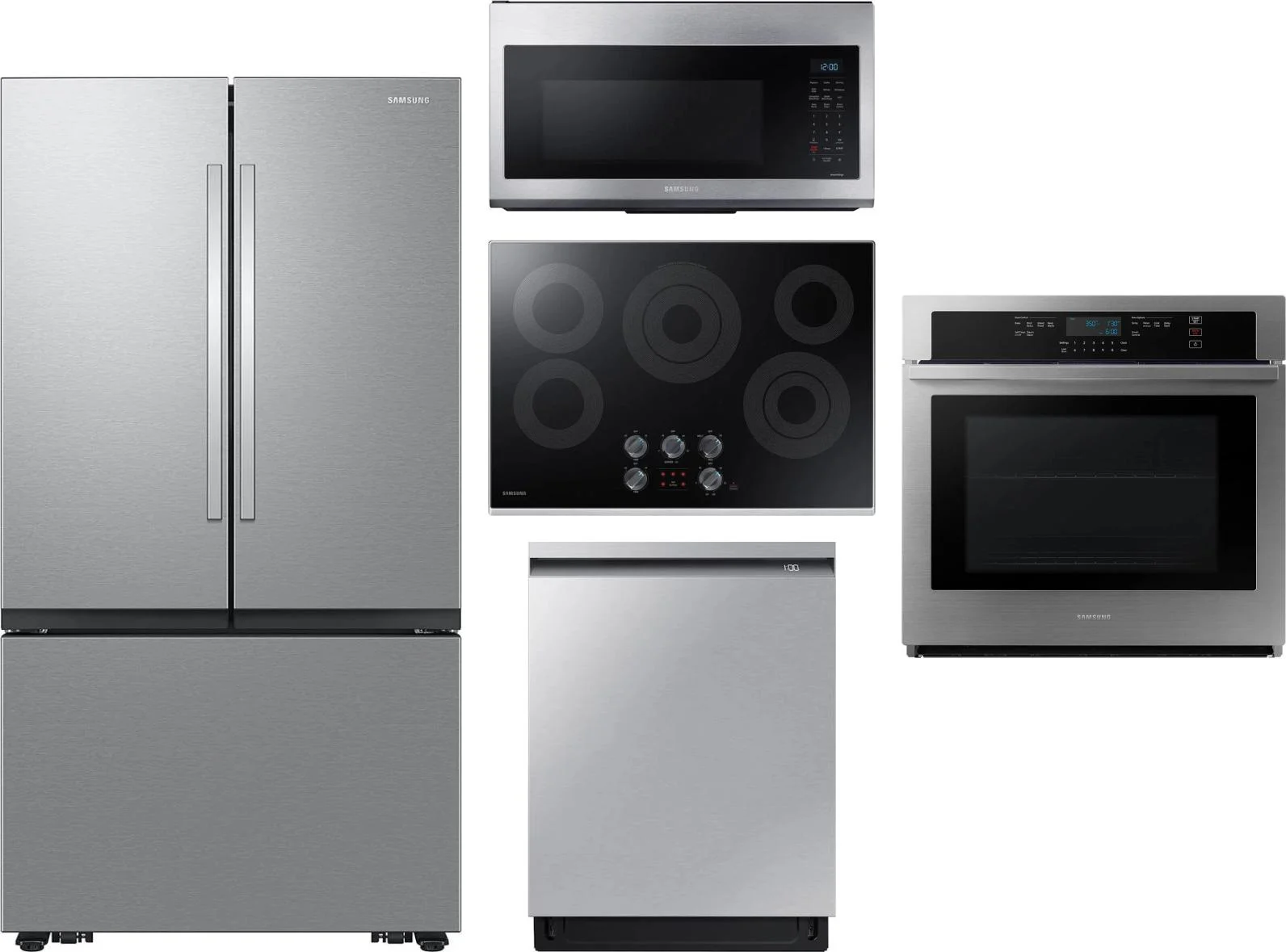 Samsung 5 Piece Package Includes Refrigerator, Cooktop, Wall Oven, Microwave And Dishwasher in Stainless Steel