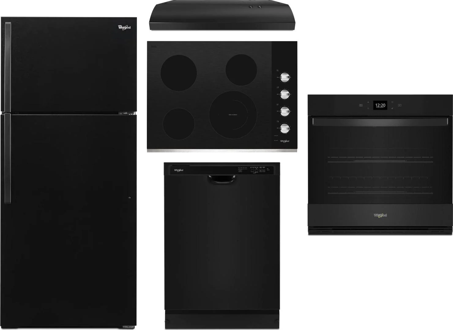 Whirlpool 5 Piece Package Includes Refrigerator, Cooktop, Wall Oven, Hood And Dishwasher in Black