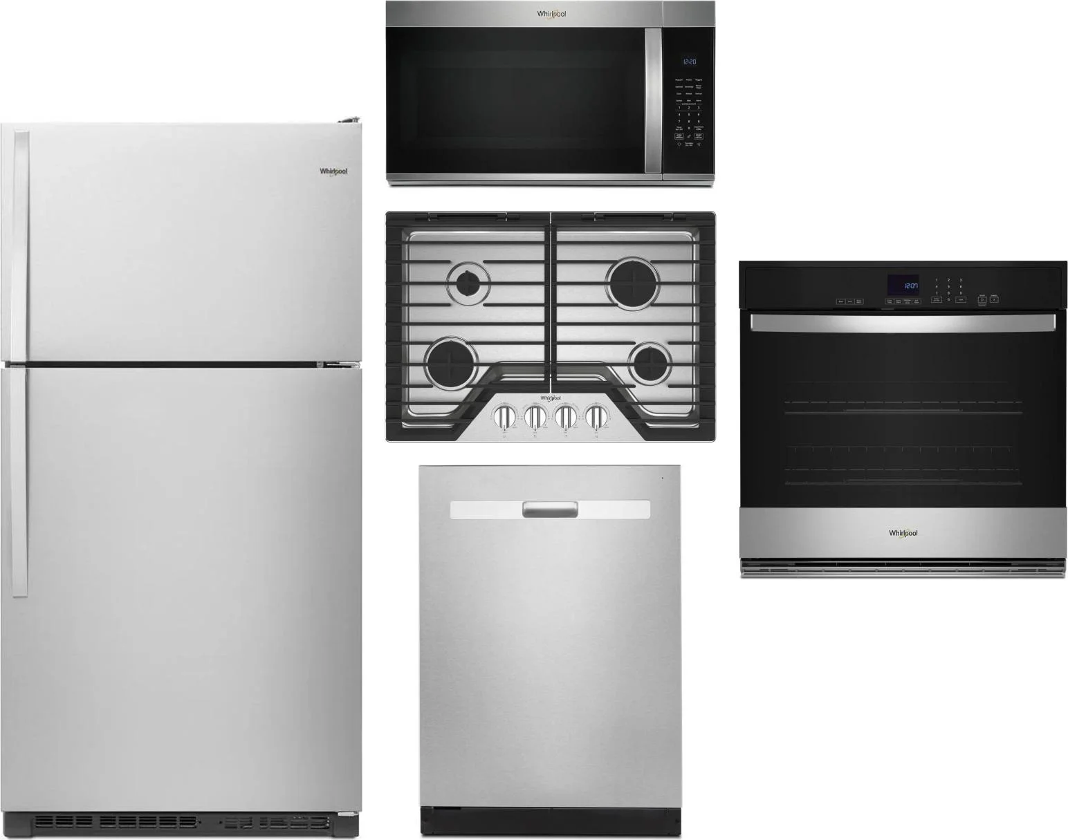 Whirlpool 5 Piece Package Includes Refrigerator, Cooktop, Wall Oven, Microwave And Dishwasher in Stainless Steel
