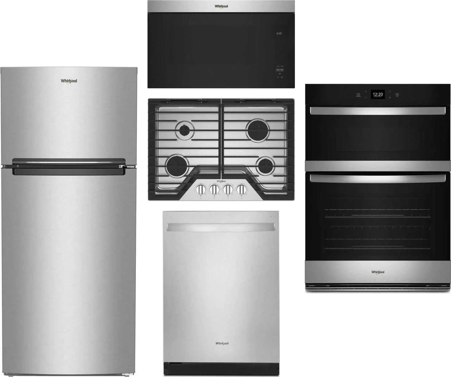 Whirlpool 5 Piece Package Includes Refrigerator, Cooktop, Wall Oven, Microwave And Dishwasher in Stainless Steel