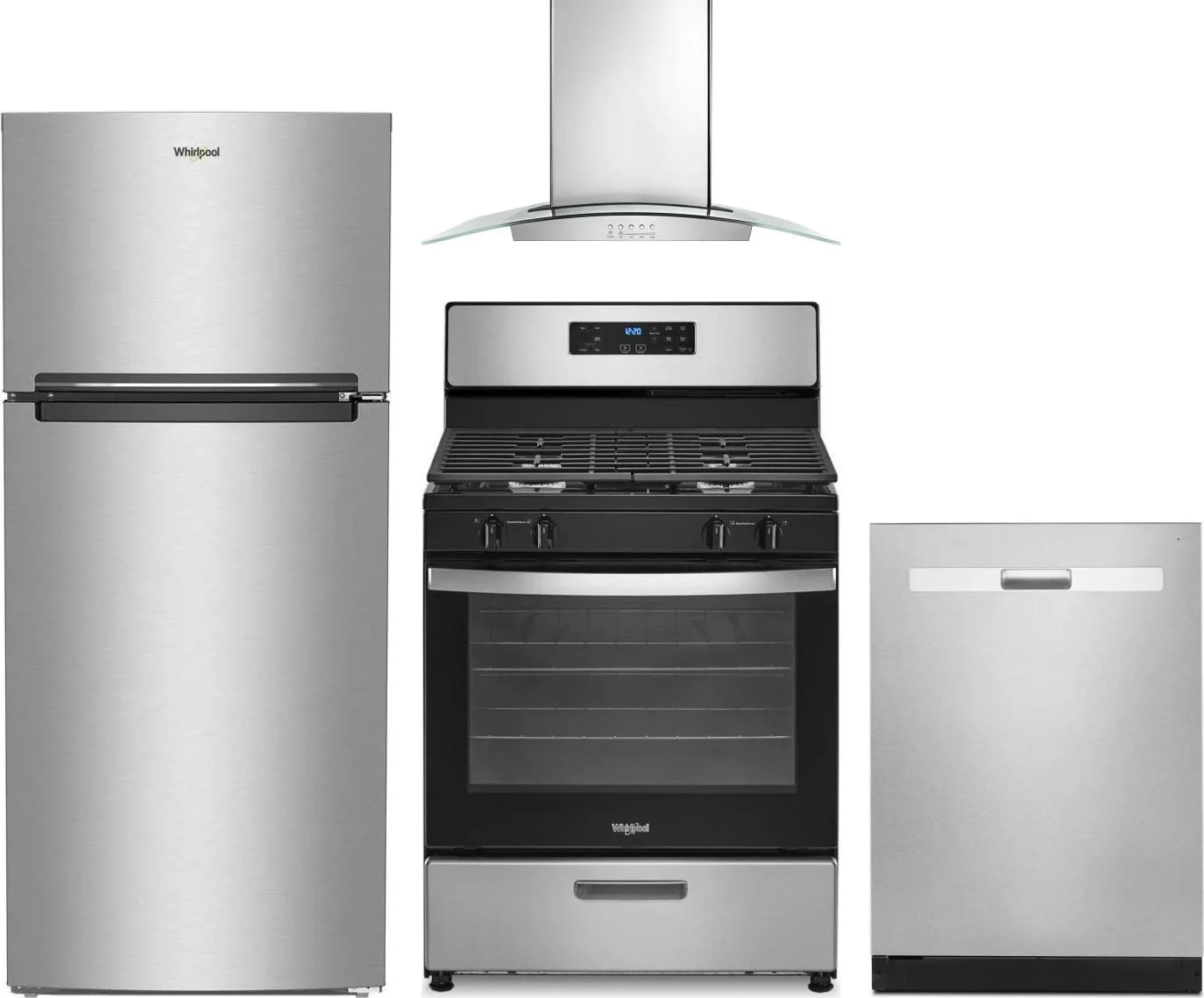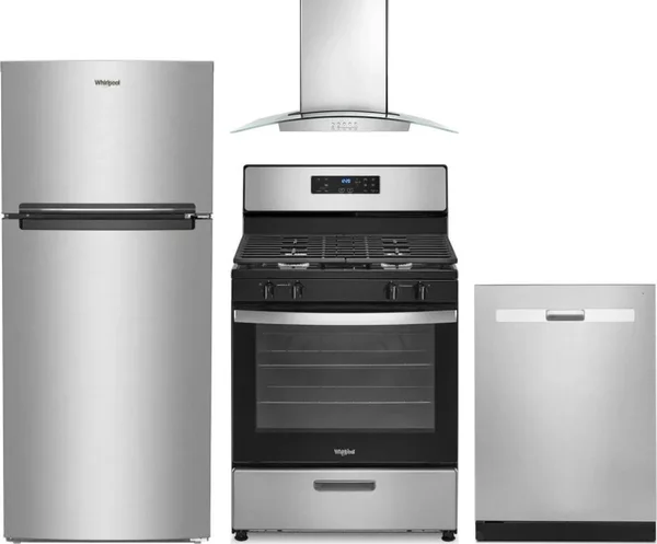 Whirlpool 4 Piece Package Includes Refrigerator, Range, Hood And Dishwasher