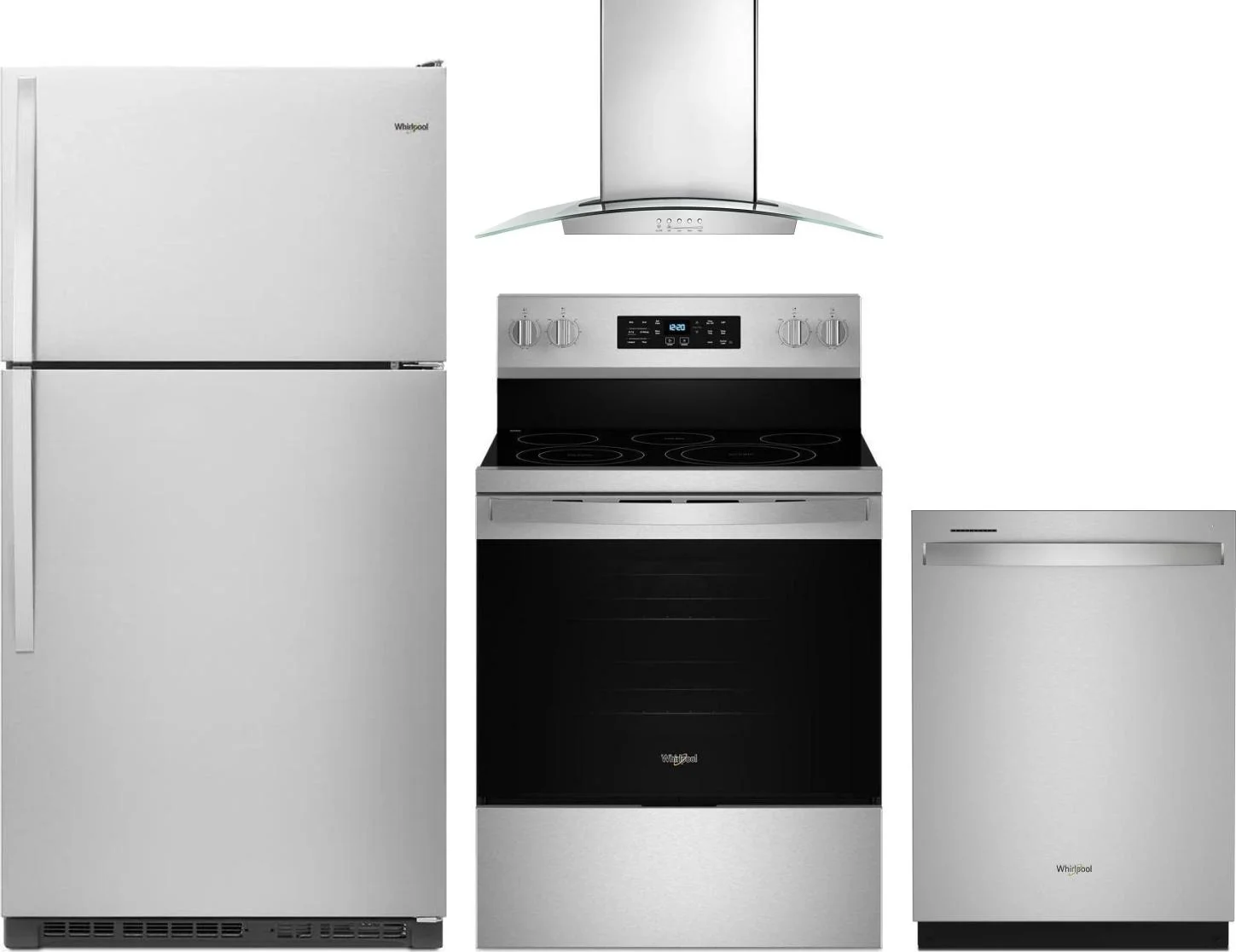 Whirlpool 4 Piece Package Includes Refrigerator, Range, Hood And Dishwasher