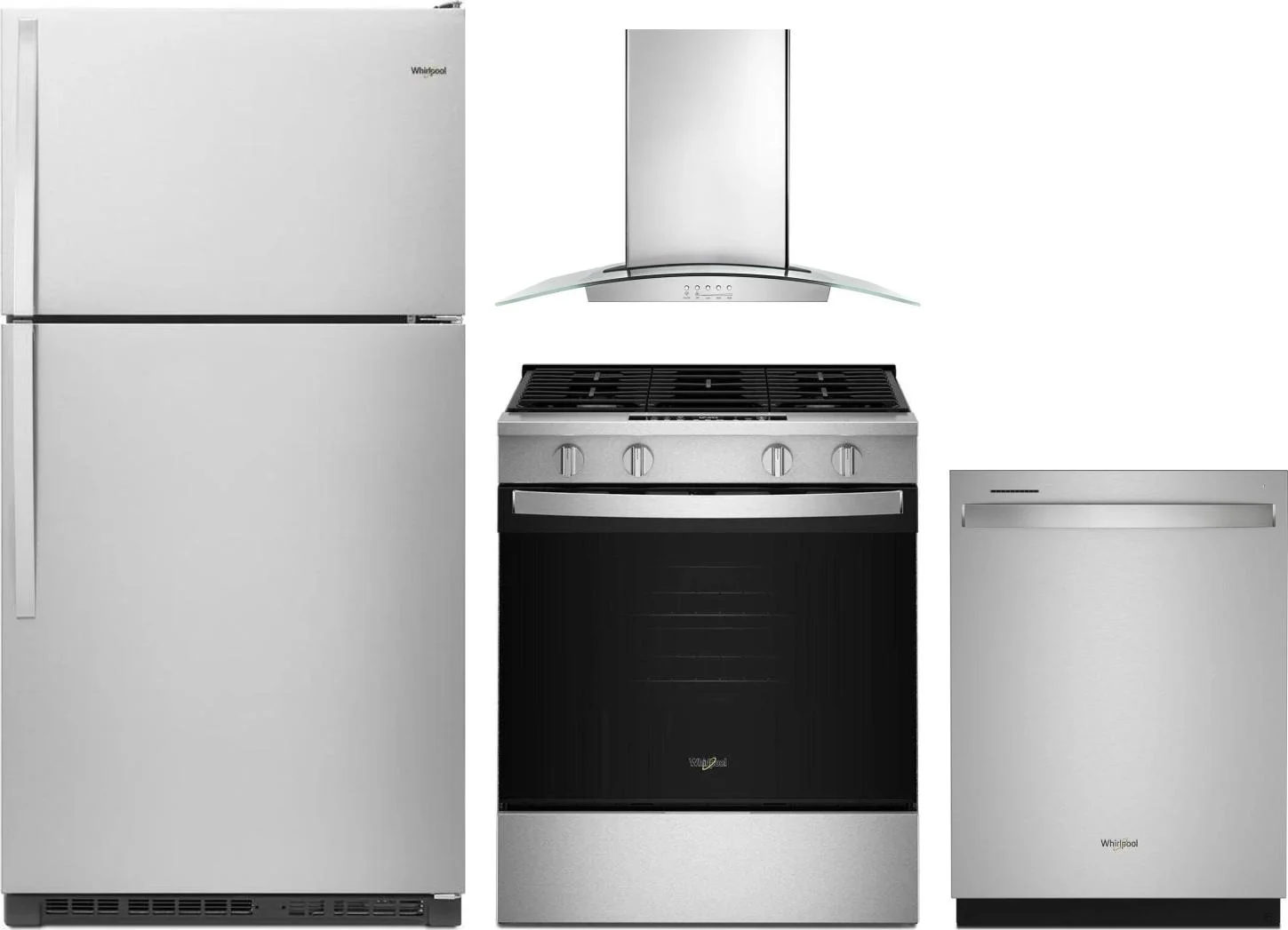 Whirlpool 4 Piece Package Includes Refrigerator, Range, Hood And Dishwasher