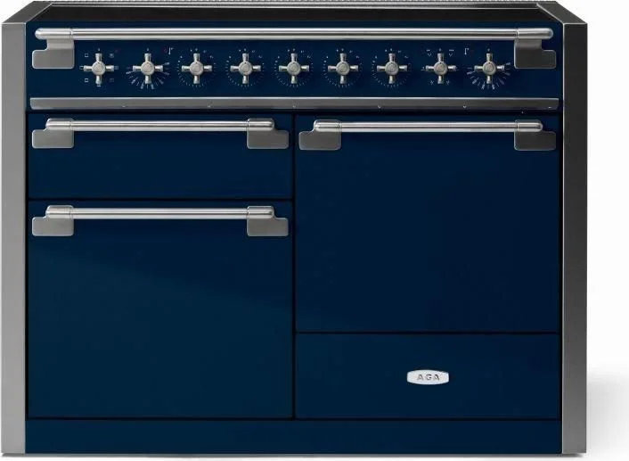 The AGA Elise 48" Induction Model features three separate ovens. The first is an electric multifunction oven with seven settings including true European dual-convection cooking, fan-assisted baking, browning, thaw and serve, convection broiling, warming, and conventional cooking. A second European convection oven offers the ability to cook multiple large dishes at once using differing heating modes and temperatures, while a third dedicated glide-out broil oven allows for dedicated top-heat broiling. The ceramic glass surface cooktop with five induction burners and integrated capacitive touch controls efficiently utilizes, transfers, and captures 90% of energy generated, as compared to only 55% with that of a traditional gas burner.