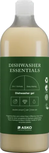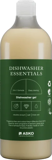 Free from colorants, paraben and animal-derived ingredients Vegan Nordic Swan Ecolabel Double enzyme for proteins and starch Fragrance-free and colour-free 3-in-1 formula contains salt and rinse aid (up to 15(degree) dh) Effective from 50 (degree)C onwards Effective at short programs Easy dosing flip cap Free of phosphonates Asthma & Allergy Nordic label Delivered in FSC certified cardboard box Suitable for Auto dosage system