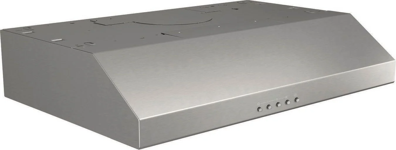 Hidden louvers on top of hood exhaust away from cabinetry