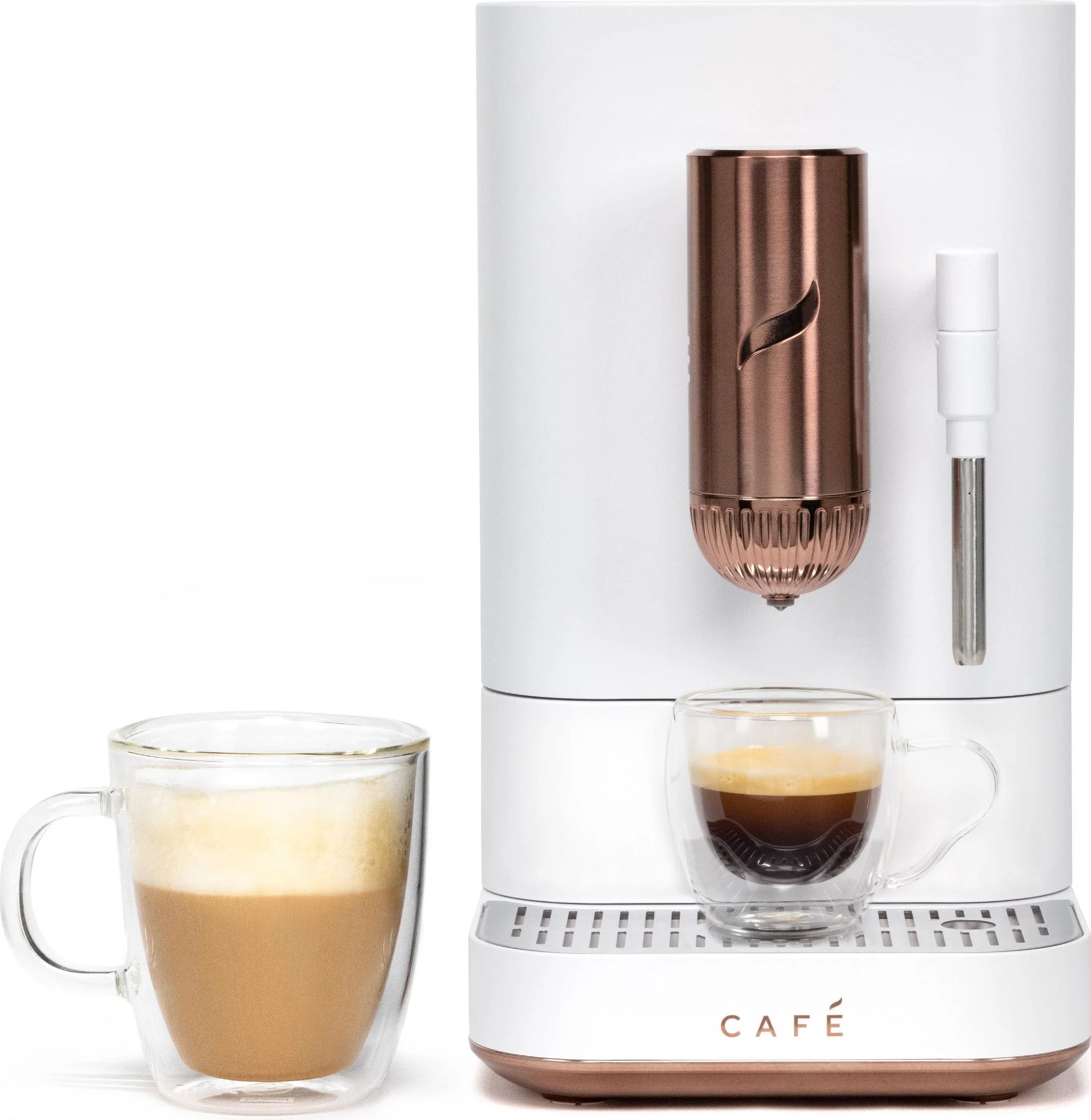 This compact espresso machine has a 7" wide footprint and is adorned with signature copper accents, adding style and sophistication to any countertop.