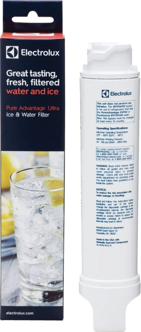 Installation and Care InstructionsNOTICE: Review Electrolux Refrigerator Use and Care Manual before installation and use of system. See fits models listing on Electrolux website.1. Remove current filter and discard.2. Slide the new filter in with the grip oriented horizontally.3. Push the filter firmly and turn 90 to the right until it snaps into place.4. Run water through the dispenser for approximately 3 minutes, or 1.5 gallons, to prime the filter before use. Discard the water.5. Replace every 6 months or 125 gallons (473 liters), whichever comes first.