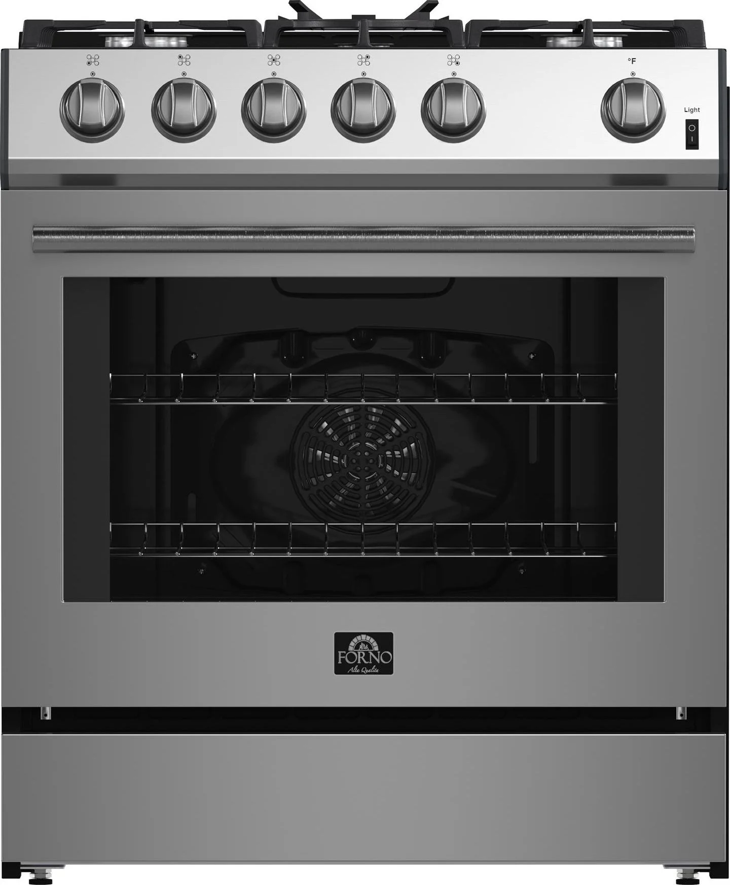 Forno Leonardo 30-Inch Stainless Steel Gas Range, 5 Sealed Burners (Totaling 39,500 BTU), 5 cu.ft. Convection Oven, Continuous Cast Iron Grates, Black Enamel Interior, Auto Re-Ignition, LP Conversion Kit Included