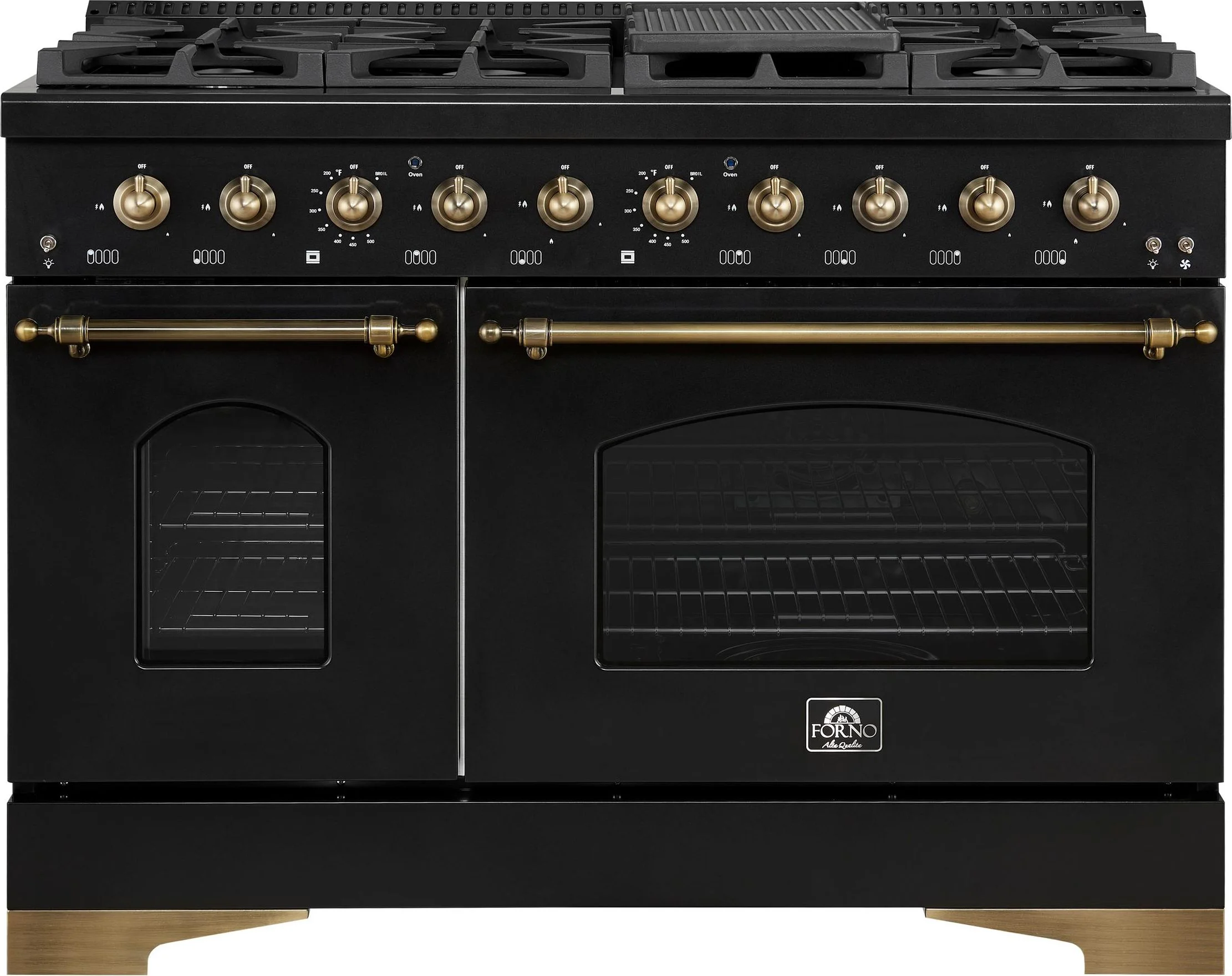 Forno Antico 48-Inch Dual Fuel Range, Black with Antique Brass Finish, 8 Burners, 94,000 BTU, 5.5 cu.ft. Double Ovens & Griddle