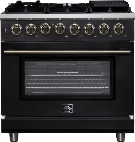 Forno Massimo 36 Inch Freestanding Dual Fuel Range in Black with Antique Brass Accessories, 6 Burners, 5.36 cu. ft. Convection Oven