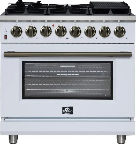 Forno Massimo 36 Inch Freestanding Dual Fuel Range in White with Antique Brass Accessories, 6 Burners, 5.36 cu. ft. Convection Oven