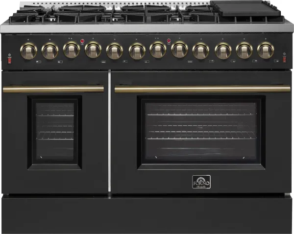 Galiano 48-inch Dual Fuel Range Black & Antique Brass Design with 8 Sealed Burners 107,000 BTU, 6.58 cu. ft. double ovens & Griddle