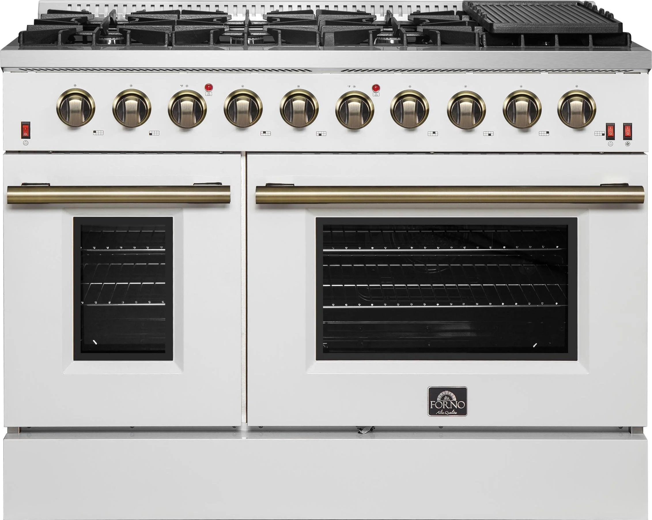 FORNO Galiano 48-inch Gas Range White & Antique Brass Design, 8 Burners, 107,000 BTU, Griddle, 6.58 cu.ft. Double Ovens