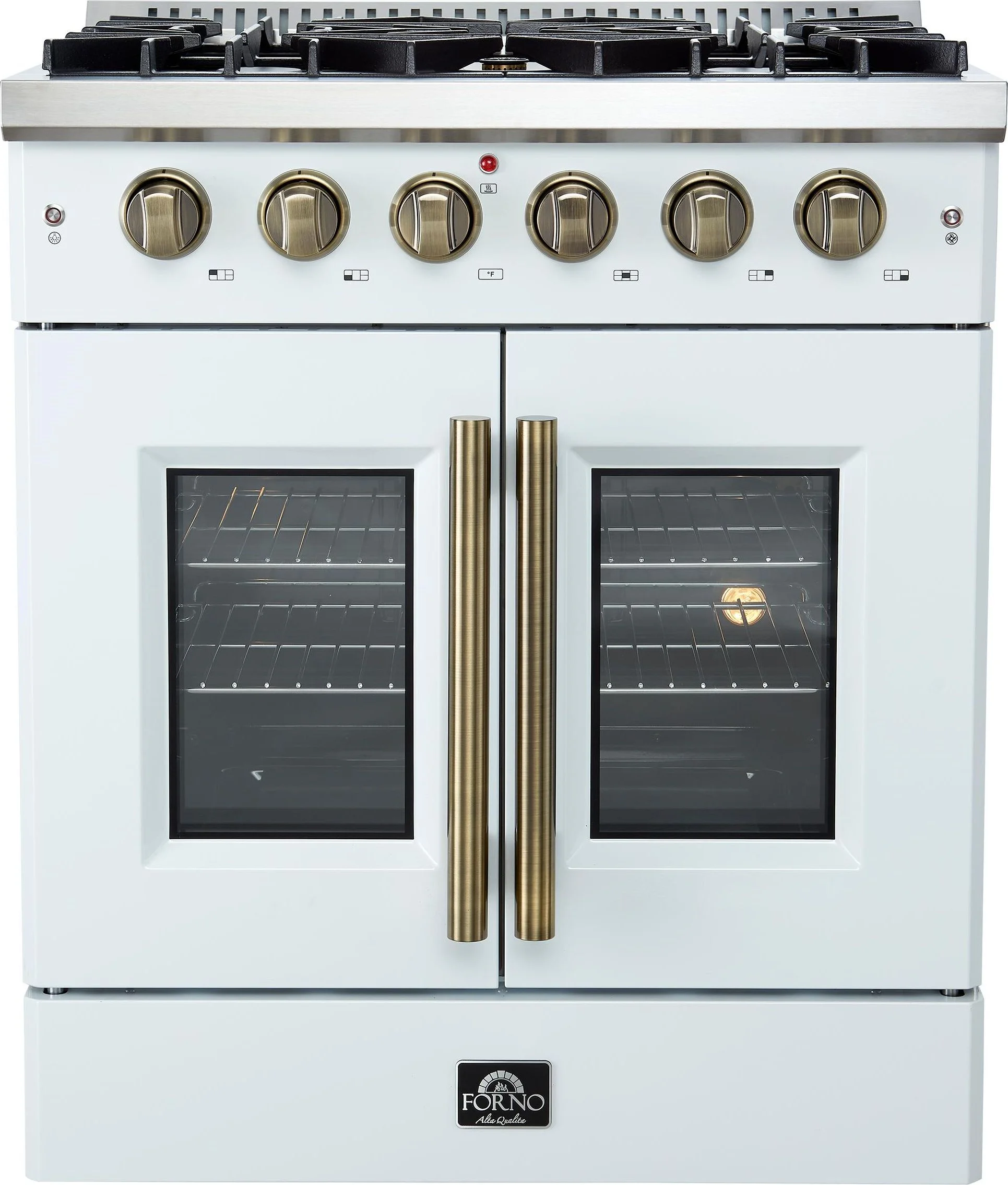 Forno Galiano 30" French Door Gas Range, White & Antique Brass, 4.32 cu.ft. Convection Oven