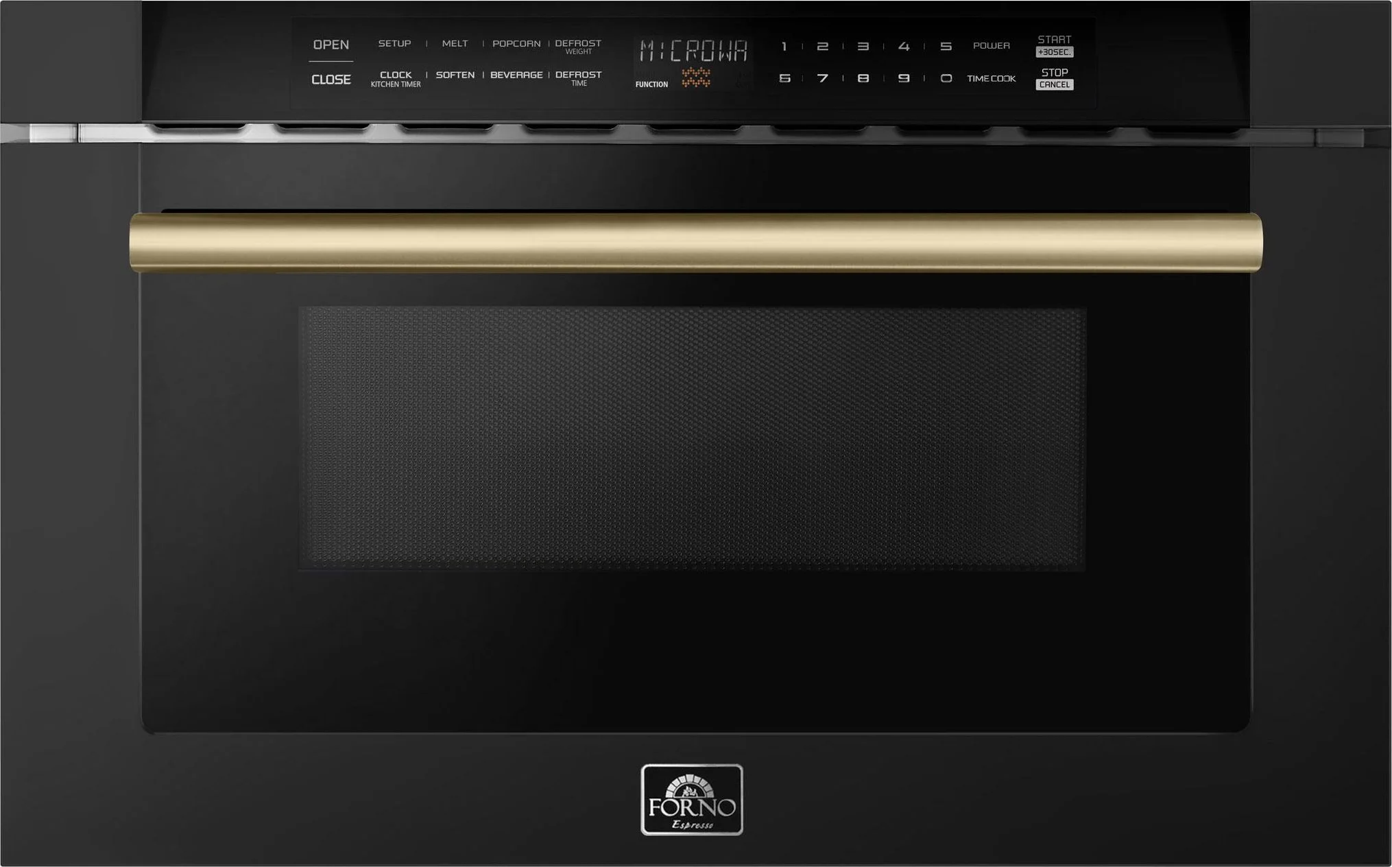 Forno Espresso Capoliveri 24" Microwave Drawer in Black, 1.2 cu.ft., 1000 Watt, Defrost Rack, Antique Brass Handle