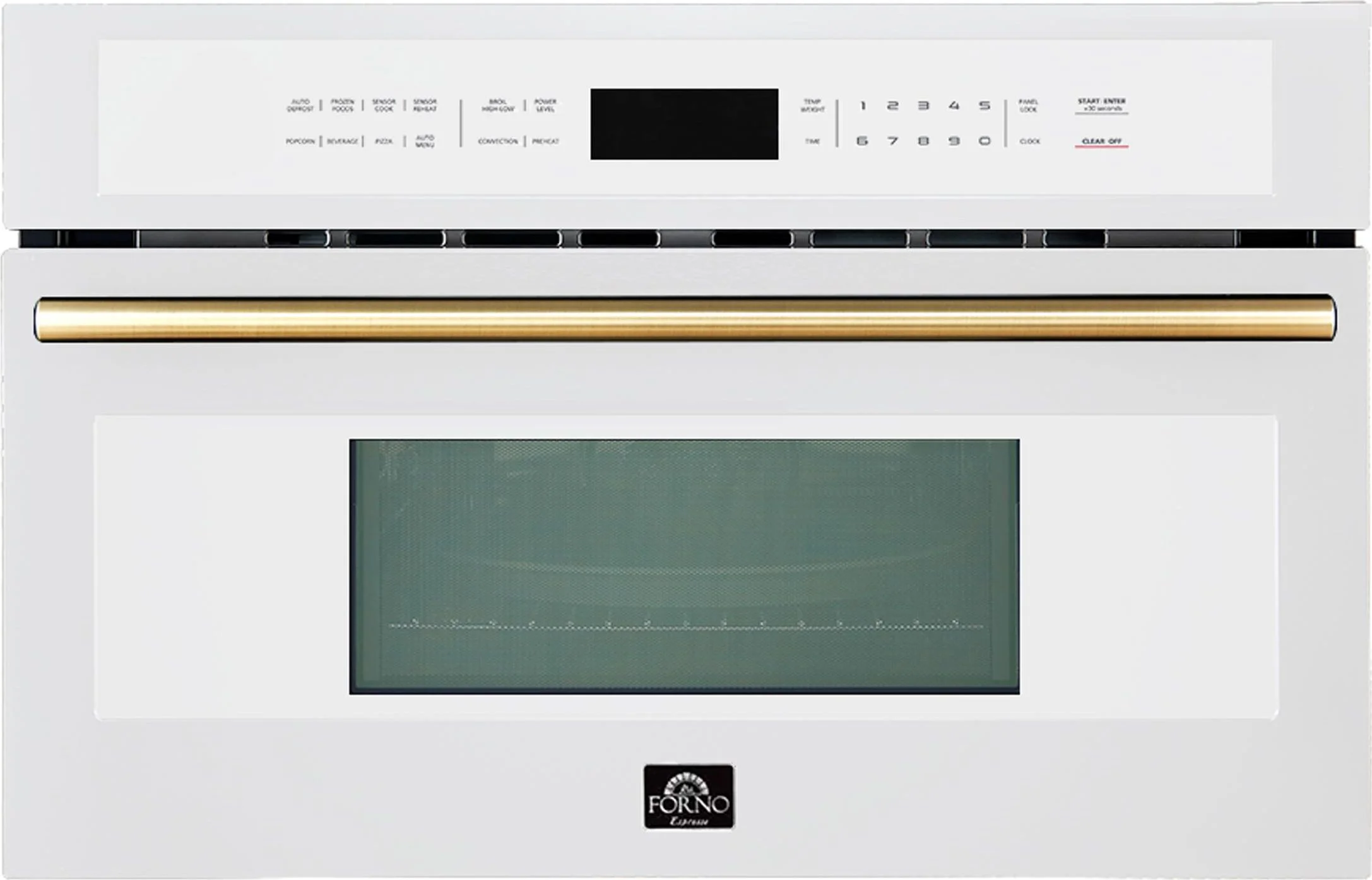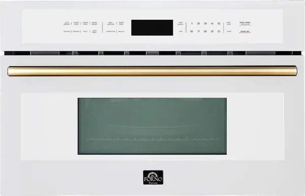 Oliena Espresso White 30 Inch Built-In Microwave Convection Oven, 1.6 cu.ft., 1000W/1750W, Antique Brass Handle, Wire Rack, Ceramic & Metal Turntable