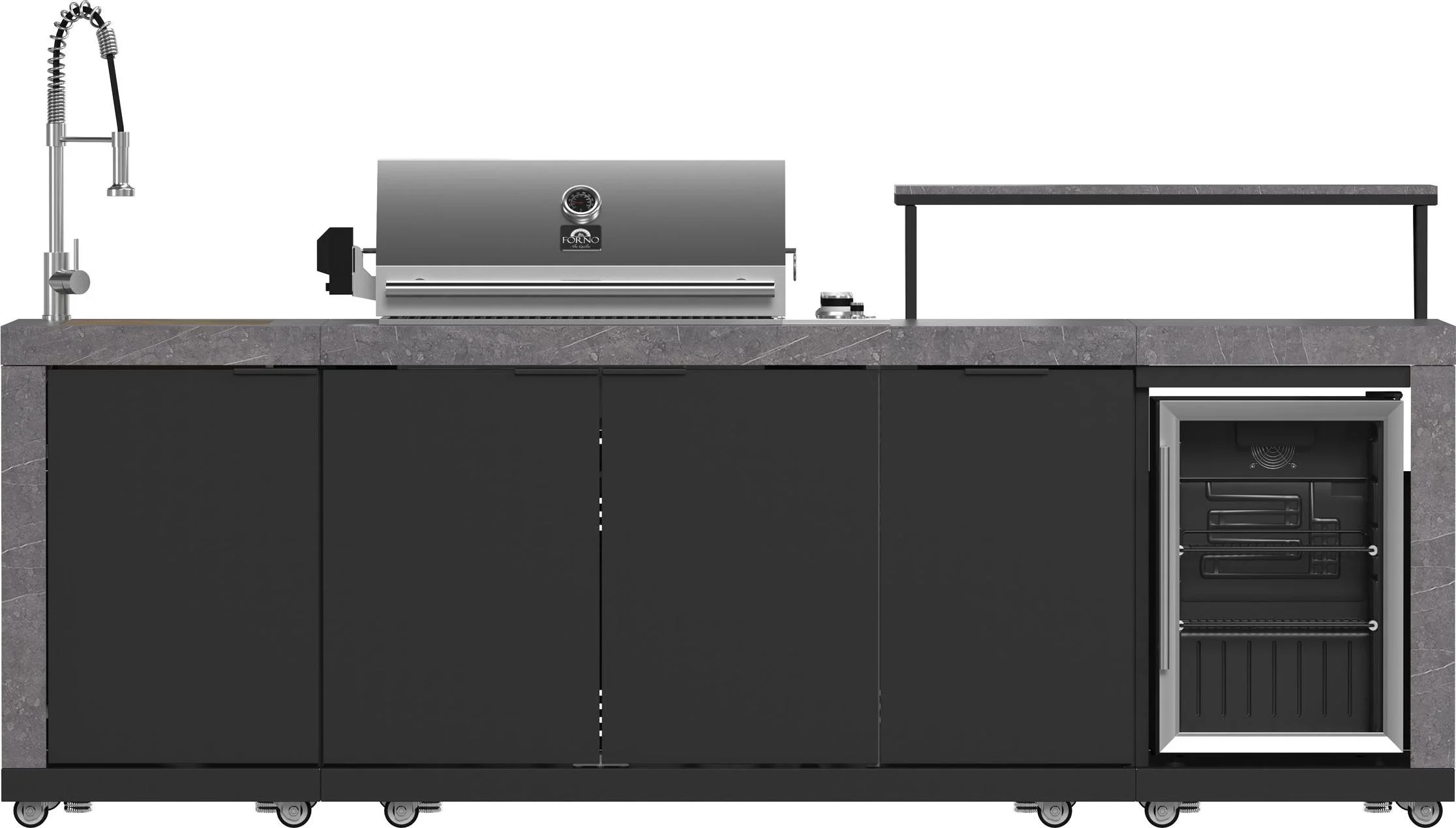 Forno Rimini Outdoor Kitchen 30" BBQ 62,600 BTU, 3 Burners with Sear & Rotisserie, 2.4 cu.ft. Beverage Center, Stainless Steel Sink, Black Cabinets & Gray Sintered Stone Countertops