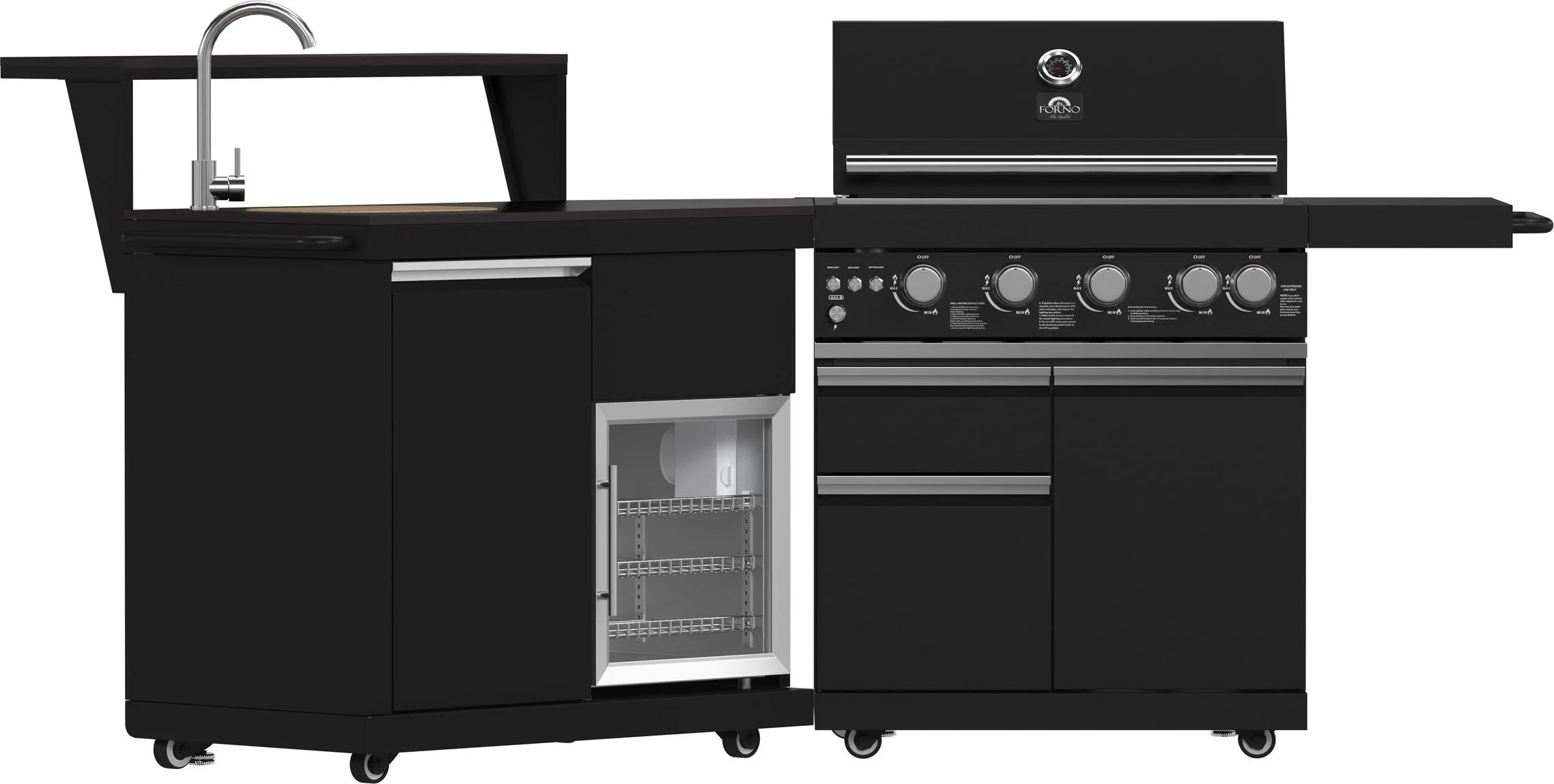 Forno All Aperto 62,600 BTU BBQ, 3 Stainless Steel Burners, Infrared Burners, Sink Module, Black Sintered Stone Countertops, Bar and Beverage Center