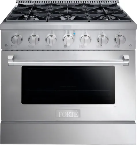 The FGR366BSS 36" Freestanding Gas Range by Fort(eback) comes with 6 Sealed Italian Burners and 4.5 cu. ft. Oven Capacity. It also features Edge to Edge Grates, Easy Glide Oven Racks, a 10K BTU Broiler and is LP Convertible.