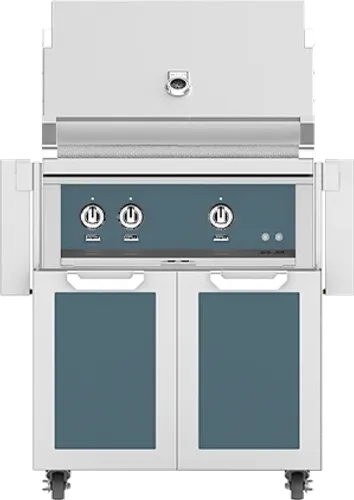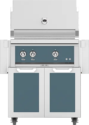 Hestan 30" Hestan Outdoor Freestanding Grill on Double Door Cart, Pacific Fog in White On Blue