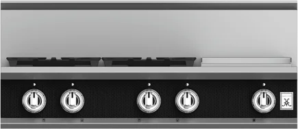 The 36 Hestan rangetop delivers searing culinary power with a sealed burner system delivering exceptional temperature control for culinary power up to 23,000 BTUs and as low as 500 BTUs. The 12 commercial-grade stainless steel gas griddle makes breakfast a cinch with superior heating and a thermostat for precise temperature control, while the continuous grates and backlit knobs combine stunning form and function.