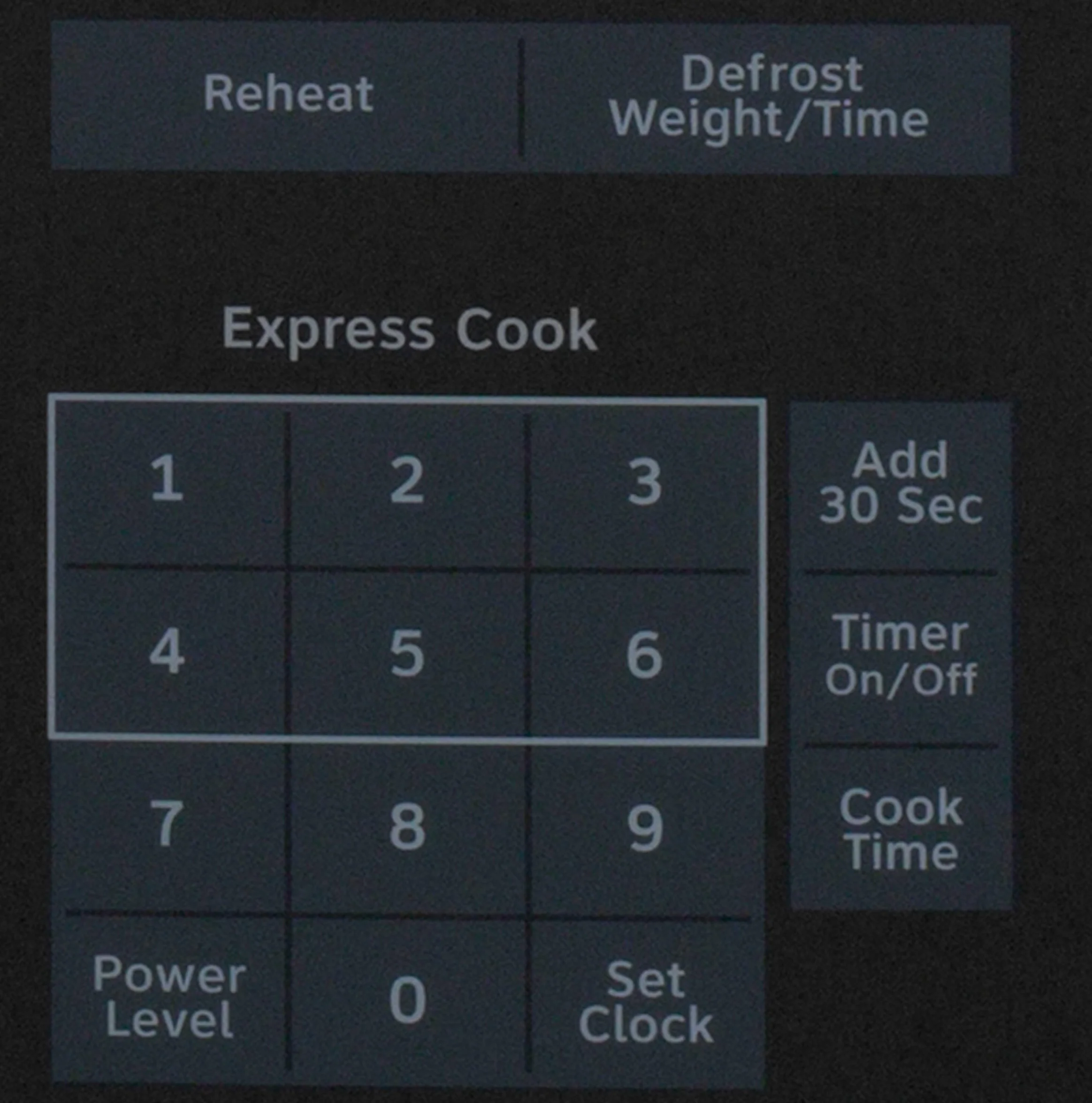 Add 30 Seconds Cancel/Off Cook Time Power Level Set Clock Start/Pause Surface Light Timer On/Off Turntable On/Off Vent Fan