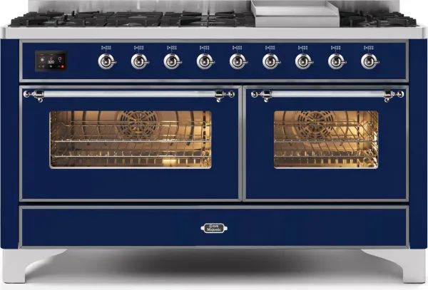 Ilve 60" Majestic II Series Freestanding Dual Fuel Double Oven Range with 8 Sealed Burners, Triple Glass Cool Door, Convection Oven, TFT Oven Control Display, Child Lock and Griddle in Midnight Blue in Blue