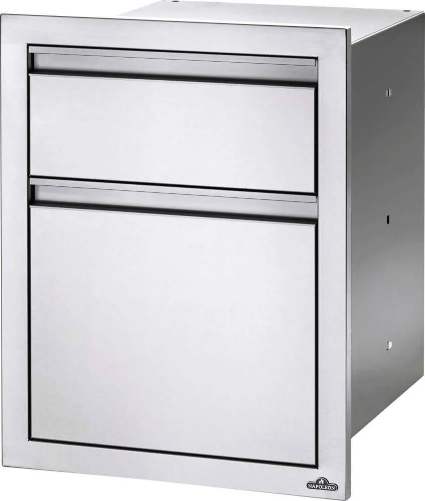 Creating your own custom grill island has never been easier with Napoleon's Built-In Components. Every great outdoor kitchen needs storage; this double drawer cabinet features waste and recycling bins that can double as storage as well as a paper towel pull out. Stainless steel construction, soft closing hardware, seamless trim, and anodized aluminum handles provide durability and endless installation possibilities.