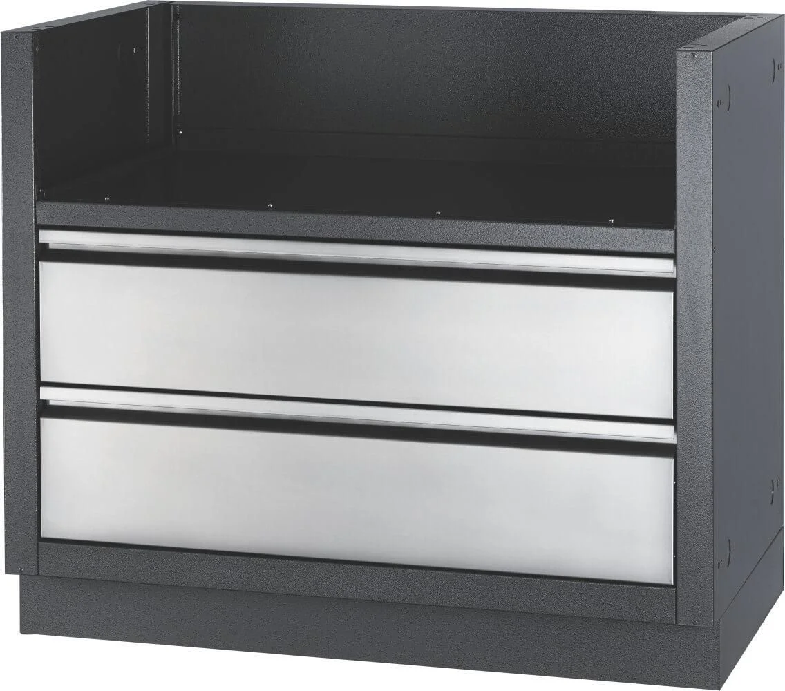 Specially made for the Built-In 700 Series 38" Gas Grill Heads, this carbon colored, powder coated, galvanneal cabinetry features increased durability from the two-coat pebbling finishing system. Two stainless steel drawers are mounted on smooth gliding tracks for under grill storage. Installation is a breeze with knockouts for gas and electrical. Levelling feet ensure a balanced surface, even if your patio isn't perfectly level. Partner this cabinet with the Built-In 700 Series 38" Gas Grill Head and the perfect OASIS cabinets for a custom outdoor grilling OASIS.
