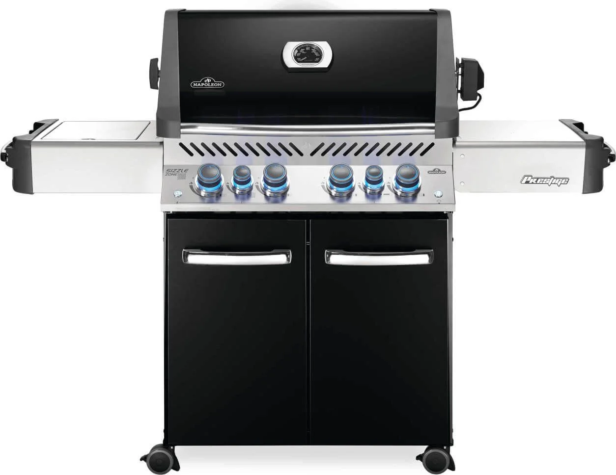 The Napoleon Prestige 500 Propane Gas Grill with Infrared Side and Rear Burners is the total grilling package; with a stunning porcelain enamel black hood and stainless steel construction, this cart model has the capabilities of a full outdoor kitchen. With four main burners, an infrared rear and side burner, this grill can cook meals using eight unique cooking styles. Grill for a crowd with a capacity for up to thirty hamburgers, and up to eight more on the side burner. You'll know it's a Napoleon with the Iconic WAVE cooking grids for those distinctive sear marks. Not just durable on the outside; under the lid, is the same quality stainless steel used for the tube burners, dual-level sear plates and cooking grids. Seven stainless steel sear plates provide extra surface area for any drippings from your food to vaporize, avoiding flare-ups. Never leave your barbecue on again as all the Prestige series grills come with the SafetyGlow feature where the control knobs glow red when the burner is on. Enjoy evenly cooked restuarant style meals with the rear infrared burner and rotisserie.