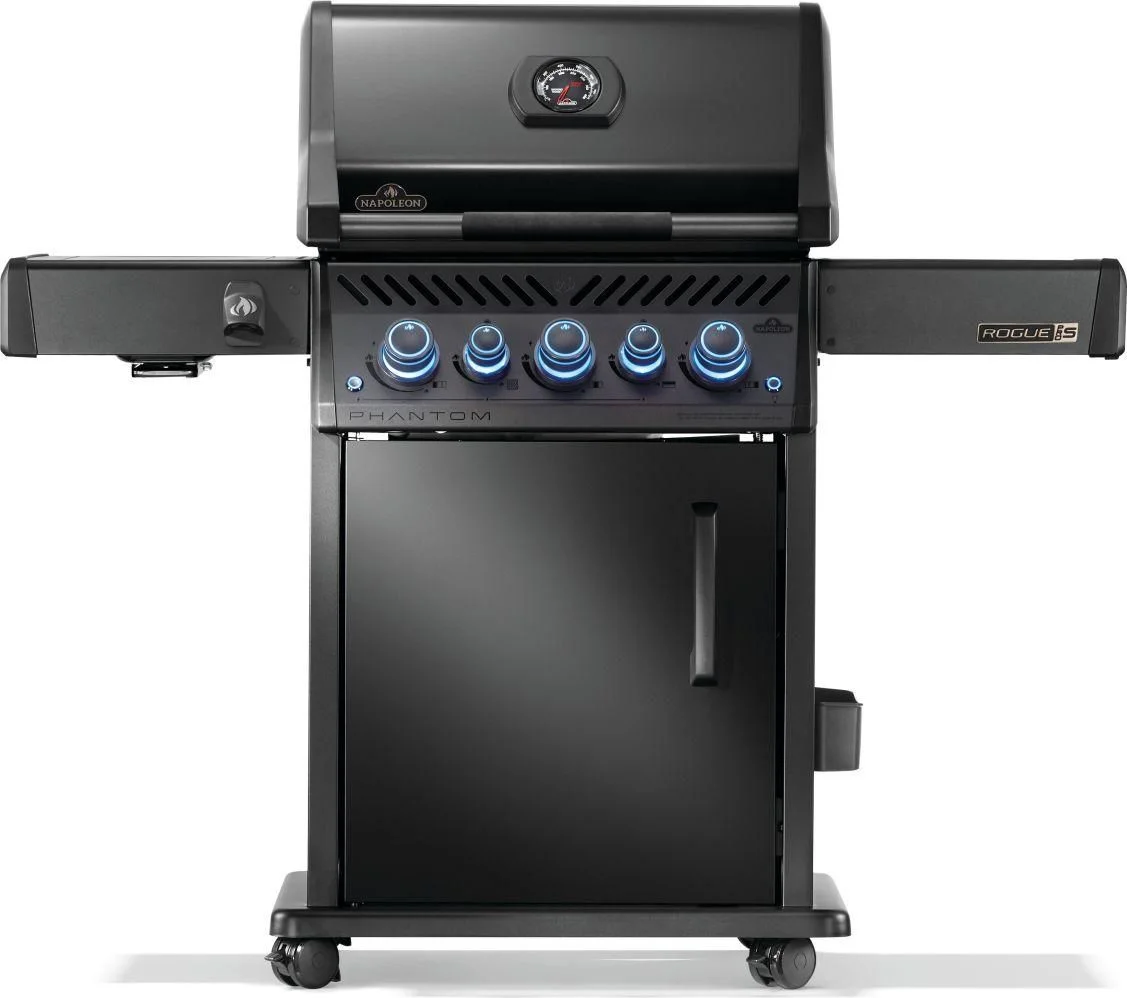 The Phantom Rogue PRO-S 425 Grill in Propane Gas, boasts a luxurious, matte black finish that exudes elegance. Crafted with premium features, this grill seamlessly combines sophistication and luxury. Its rear infrared rotisserie burner guarantees succulent roast meals, while the infrared sear station, side burner delivers restaurant-quality sides and sauces or sears meat to perfection. The iconic WAVE shaped cooking grids ensure even heating, while dual-level stainless steel sear plates vaporize drippings, keeping your barbecue pristine. With ergonomic control knobs for easy and safe operation and a battery-free starter for instant ignition, this grill is designed for effortless performance. A convenient space-saving folding side shelf and easy-locking casters enhance versatility. Elevate your outdoor grilling experience with this premium BBQ, offering superior quality and style. Rotisserie sold separately.