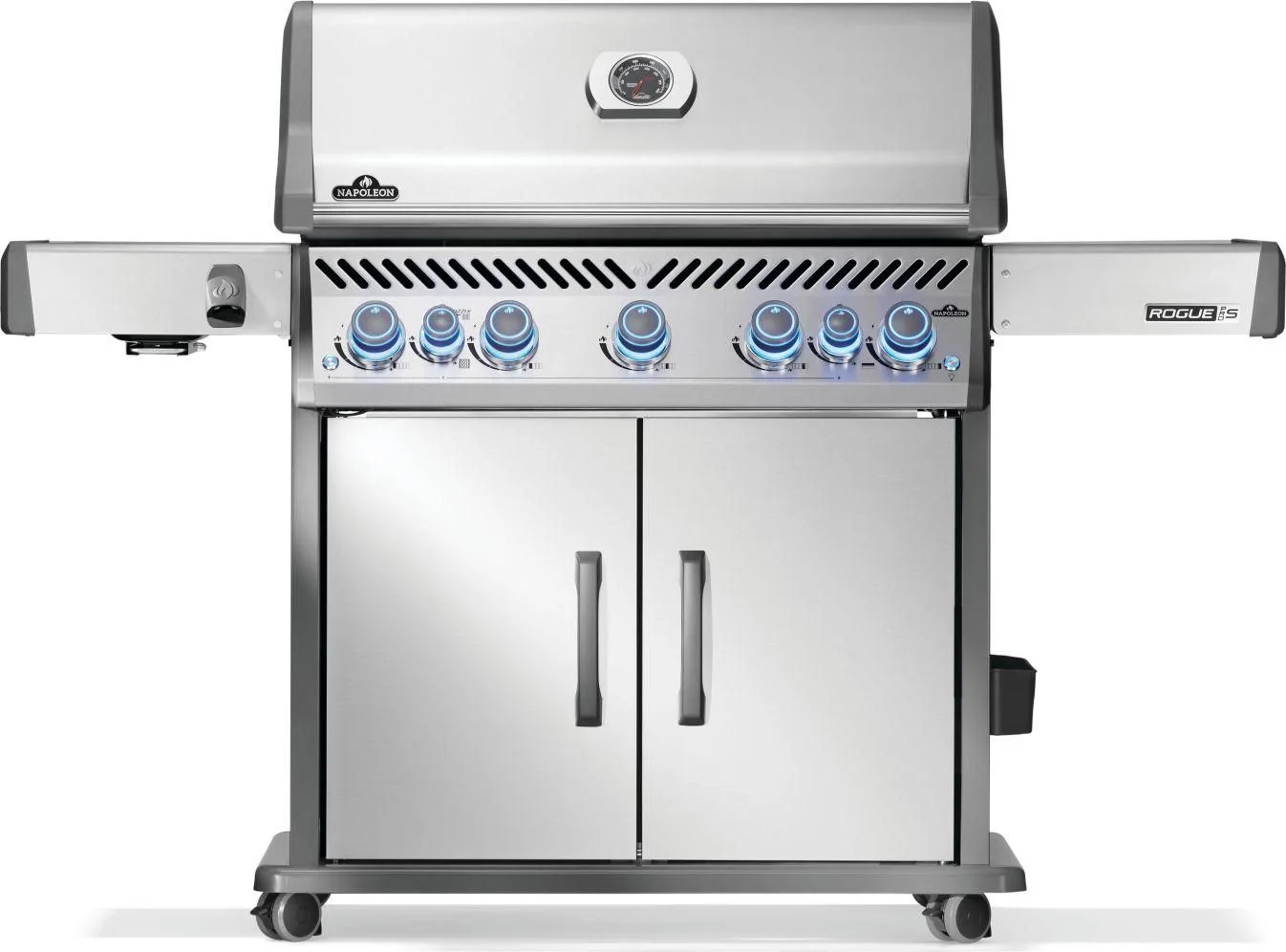 When premium features combine with excellence; you get the Rogue PRO-S 625 Stainless Steel Grill in Natural Gas. Experience succulent roast meals with the rear infrared rotisserie burner, while the large infrared sear station, side burner delivers restaurant-quality sauces, sides, or sears meat perfectly. The iconic WAVE shaped cooking grids ensure even heating and prevent food from falling through while dual-level stainless steel sear plates keep your grill pristine by vaporizing drippings. The ergonomic control knobs feature SaftyGlow, illuminating red when a burner is in use, making operation safe and effortless. A convenient, space-saving folding side shelf and easy-locking casters ensure convenience. The durable and stunning stainless steel construction is easy to maintain and withstands all environments. Elevate your outdoor grilling with superior quality and style. Welcome the ultimate grilling experience with the Rogue PRO-S grill.