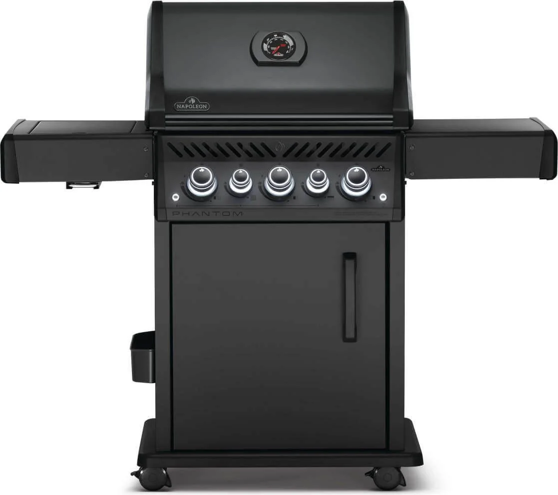 Deep and dark, the matte black Phantom Rogue SE 425 Propane Gas Grill with Infrared Side and Rear Burners is a barbecue like no other. From the top of the lid to the easy to move locking casters, this gas barbecue is completely silky matte black. The edgy Phantom Rogue SE features maintenance-free, stainless steel cooking grids and an integrated multifunctional grilling rack - ideal for entertaining. Sear the perfect steak or create a delightful side dish over the generous infrared sear station side burner. Use the rear infrared rotisserie burner to slow roast food to perfection. The generous folding side shelves provide plenty of prep and serving space while ensuring that your space is maximized. This luxurious matte black barbecue won't leave you in the dark either, the ergonomic knobs are backlit to ensure that late-night entertaining is easy. The Phantom Rogue SE 425 Gas Grill is more than just a look. It's a lifestyle.