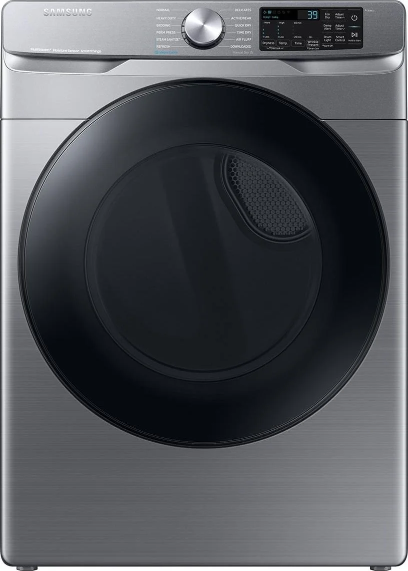 Samsung's new 7.5 cu. ft. dryer allows you to remotely start or stop your cycle, schedule laundry on your time, receive end of cycle alerts, and more, right from your smartphone.* Steam Sanitize+ eliminates 99.9% of germs and bacteria,** while Multi-Steam technology relaxes and smooths away wrinkles from everyday wear.
