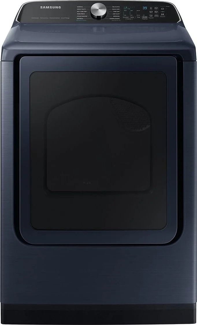 Samsung's 7.4 cu. ft. smart front load electric dryer in brushed navy has a Pet Care Dry setting that helps remove 97% of pet odors.