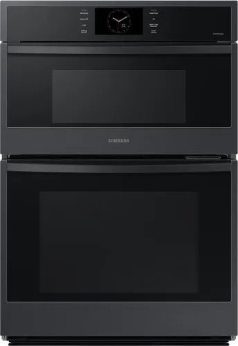 The Matte Black Samsung 30" Microwave Combination Wall Oven with Steam Cook features stunning stainless steel finishes that blend seamlessly with the d(eback)cor of your kitchen.