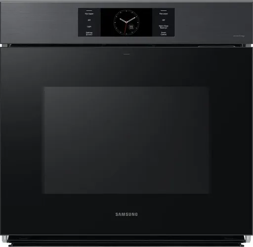 The Matte Black Samsung Bespoke 30" Single Wall Oven with AI Pro Cooking(TM) Camera features stunning glass and steel finishes that complement other Bespoke appliances in your kitchen.