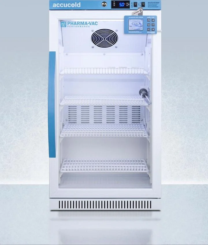 Accucold's Pharma-Vac Performance Series are upright all-refrigerators designed and purpose-built for pharmacy, medication, and vaccine applications to support meeting CDC/VFC/VFA guidelines. The ARG31PVBIADADL2B is a 2.83 cu.ft. all-refrigerator with a temperature range of +2(degree)C to +8(degree)C. Sized at 32" high to fit under lower counters complying with ADA guidelines for accessibility. It is designed for freestanding or recessed installation. The microprocessor temperature controller is externally located to minimize door openings, helping to protect stored contents from ambient temperature. The buffered temperature probe is encased in a glycol-filled bottle to better simulate temperature of the stored product, with an additional sensor that reads air temperature to ensure superior temperature control. The current and min/max temperature display is viewable in Celsius or Fahrenheit to the nearest tenth of a degree. The audible and visual temperature alarm sounds if the unit's interior goes out of range. Additional alarms include a power failure alert, door open alarm, and sensor failure alarm. This model is equipped with remote alarm contacts in the rear and a 1/2" probe port on the right side to accept additional monitoring devices. A hospital grade cord with 'green dot' plug is also included for added safety in high traffic areas. We also include our DL2B digital data logger to be mounted to the door, a feature recommended by the CDC, VFC and VFA for vaccine storage. This password-protected DDL is NIST calibrated in our ISO/IEC 17025:2017 accredited laboratory and offers a large LCD display of the current and high/low temperature, recording up to 32,000 data groups to its internal memory or even more on the included 4GB USB flash drive. Data can be viewed through a PC or Mac in Microsoft Excel or any .CSV compatible program. Users can set their own recording intervals starting at increments of 10 seconds to best meet a facility's specific logging needs. We include a 2-year certificate of calibration beginning the date of manufacture. The logger can be re-calibrated in our laboratories after the certificate expires. (For additional information on the DDL, see the DL2BKit listing on our website.) Inside, the ARG31PVBIADADL2B utilizes adjustable cycle defrost operation to avoid temperature spikes. Optimized forced air cooling with an internal fan to ensure excellent temperature stability and uniformity with rapid recovery after door openings. The adjustable plastic-coated wire shelves can be positioned at 1/2" increments to accommodate virtually any sized item. This unit includes LED internal lighting with an on/off rocker switch. The interior is constructed from white powder coated metal to ensure added durability and better temperature retention. The ARG31PVBIADADL2B comes in a white cabinet finish with a blue accented control panel. The factory-installed antimicrobial handle is powder-coated with naturally occurring silver ions, which help to reduce the spread of germs, allowing for a safer, cleaner user experience. The double pane tempered glass door provides a full view of the interior. The door ships with a right hand swing and self-closing function, while a factory-installed lock provides security as needed, with two keys for staff use. Powerful magnetic gaskets ensure a positive seal. Designed with hydrocarbon refrigerant, the ARG31PVBIADADL2B provides an energy efficient solution to vaccine storage. This unit is Pyxis, Omnicell, and AcuDose RX compatible. Additional sizes, as well as solid door options, are also available. Explore the full Pharma-Vac series at accucold.com/pharmavac. NOTE: Accucold refrigerators are purpose-built to the support meeting the current CDC (Centers for Disease Control) guidelines for the storage of vaccines. Units that end in suffix "456" have been certified to the new NSF 456 standard. As referenced in the current Vaccine Storage and Handling Toolkit, these units incorporate microprocessor controls and forced air circulation for stable operation between 2 and 8 C. For additional temperature assurance, the CDC recommends a calibrated digital data logger (DDL), which can be added with the factory-installed option DL2B or addition of the DL2BKit accessory.