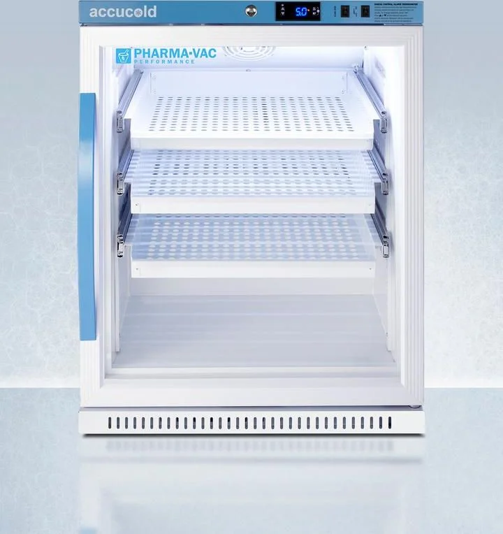 Accucold's Pharma-Vac Performance Series are upright all-refrigerators designed and purpose-built for pharmacy, medication, and vaccine applications to support meeting CDC/VFC/VFA guidelines. The ARG61PVBIADADR is a 6 cu.ft. all-refrigerator with a temperature range of +2(degree)C to +8(degree)C. Sized at just under 32" high to fit under lower counters complying with ADA guidelines for accessibility. It is designed for freestanding or recessed installation. The microprocessor temperature controller is externally located to minimize door openings, helping to protect stored contents from ambient temperature. The buffered temperature probe is encased in a glycol-filled bottle to better simulate temperature of the stored product, with an additional sensor that reads air temperature to ensure superior temperature control. The current and min/max temperature display is viewable in Celsius or Fahrenheit to the nearest tenth of a degree. The audible and visual temperature alarm sounds if the unit's interior goes out of range. Additional alarms include a power failure alert, door open alarm, and sensor failure alarm. This model is equipped with remote alarm contacts in the rear and a 1/2" probe port on the right side to accept additional monitoring devices. A hospital grade cord with 'green dot' plug is also included for added safety in high traffic areas. Inside, the ARG61PVBIADADR utilizes adjustable cycle defrost operation to avoid temperature spikes. Optimized forced air cooling with an internal fan to ensure excellent temperature stability and uniformity with rapid recovery after door openings. Three white powder-coated aluminum drawers provide ample storage and easy organization. Positioned on ball-bearing glides, the drawers offer full-extension for complete product access. Additionally, each drawer is removable allowing for transport of contents as needed. The drawers also lock into place for added security, while the perforated bottom ensures proper ventilation throughout the unit. This unit includes LED internal lighting with an on/off rocker switch. The interior is constructed from white powder coated metal to ensure added durability and better temperature retention. The ARG61PVBIADADR comes in a white cabinet finish with a blue accented control panel. The factory-installed antimicrobial handle is powder-coated with naturally occurring silver ions, which help to reduce the spread of germs, allowing for a safer, cleaner user experience. The double pane tempered glass door provides a full view of the interior. The user-reversible door ships with a right hand swing and self-closing function, while a factory-installed lock provides security as needed, with two keys for staff use. Powerful magnetic gaskets ensure a positive seal. Designed with hydrocarbon refrigerant, the ARG61PVBIADADR provides an energy efficient solution to vaccine storage. This unit is Pyxis, Omnicell, and AcuDose RX compatible. Additional sizes, as well as solid door options, are also available. Explore the full Pharma-Vac series at accucold.com/pharmavac. NOTE: Accucold refrigerators are purpose-built to the support meeting the current CDC (Centers for Disease Control) guidelines for the storage of vaccines. Units that end in suffix "456" have been certified to the new NSF 456 standard. As referenced in the current Vaccine Storage and Handling Toolkit, these units incorporate microprocessor controls and forced air circulation for stable operation between 2 and 8 C. For additional temperature assurance, the CDC recommends a calibrated digital data logger (DDL), which can be added with the factory-installed option DL2B or addition of the DL2BKit accessory.