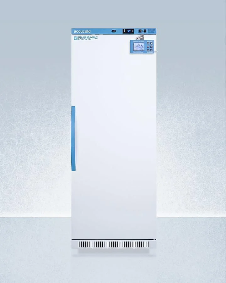 Accucold's Pharma-Vac Performance Series are upright all-refrigerators designed and purpose-built for pharmacy, medication, and vaccine applications to support meeting CDC/VFC/VFA guidelines, with a powder-coated silver ion handle that helps prevent germ spread. The ARS12PV is a 12 cu.ft. all-refrigerator with an adjustable control range from +2 to +8 C. The microprocessor temperature controller is externally located to minimize door openings, helping to protect stored contents from ambient temperature. The buffered temperature probe is encased in a glycol-filled bottle to better simulate temperature of the stored product, with an additional sensor that reads air temperature to ensure superior temperature control. The current and min/max temperature display is viewable in Celsius or Fahrenheit to the nearest tenth of a degree. This refrigerator includes a high/low temperature alarm, as well as a power failure alert, door open alarm, and sensor failure alarm. This unit is equipped with remote alarm contacts in the rear and a 1/2" probe port. A hospital grade cord with 'green dot' plug is also included for added safety in high traffic areas. We also include our DL2B digital data logger to be mounted to the door, a feature recommended by the CDC, VFC and VFA for vaccine storage. This password-protected DDL is NIST calibrated in our ISO/IEC 17025:2017 accredited laboratory and offers a large LCD display of the current and high/low temperature, recording up to 32,000 data groups to its internal memory or even more on the included 4GB USB flash drive. Data can be viewed through a PC or Mac in Microsoft Excel or any .CSV compatible program. Users can set their own recording intervals starting at increments of 10 seconds to best meet a facility's specific logging needs. We include a 2-year certificate of calibration beginning the date of manufacture. The logger can be re-calibrated in our laboratories after the certificate expires. (For additional information on the DDL, see the DL2BKit listing on our website.) Inside, the ARS12PVDL2B utilizes adjustable cycle defrost operation to avoid temperature spikes. Optimized forced air cooling with one internal fan ensures excellent temperature stability and uniformity with rapid recovery after door openings. The adjustable plastic-coated wire shelves can be positioned at 1/2" increments to accommodate virtually any sized item. We include seven shelves, more than competitor products providing to maximize interior shelving storage area. This unit includes LED internal lighting with an on/off rocker switch. The interior is constructed from white powder coated metal to ensure added durability and better temperature retention. The ARS12PVDL2B comes in a white cabinet finish with a blue accented control panel. The factory-installed antimicrobial handle is powder-coated with naturally occurring silver ions, which help to reduce the spread of germs, allowing for a safer, cleaner user experience. This model includes a factory-installed lock and ships with two keys for staff use. Powerful magnetic gaskets ensure a positive seal. Designed with hydrocarbon refrigerant, the ARS12PVDL2B provides an energy efficient solution to vaccine storage. This unit is Pyxis, Omnicell, and AcuDose RX compatible. Additional sizes, as well as glass door options, are also available. Explore the full Pharma-Vac series at accucold.com/pharmavac. Note: The DL2B data logger adds 1 1/2" to the depth of the upper right hand corner of the door (not included in the listed specifications on this page). NOTE: Accucold refrigerators are purpose-built to the support meeting the current CDC (Centers for Disease Control) guidelines for the storage of vaccines. Units that end in suffix "456" have been certified to the new NSF 456 standard. As referenced in the current Vaccine Storage and Handling Toolkit, these units incorporate microprocessor controls and forced air circulation for stable operation between 2 and 8 C. For additional temperature assurance, the CDC recommends a calibrated digital data logger (DDL), which can be added with the factory-installed option DL2B or addition of the DL2BKit accessory.