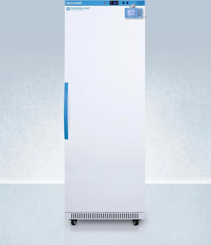 Accucold's Pharma-Vac Performance Series are upright all-refrigerators designed and purpose-built for pharmacy, medication, and vaccine applications to support meeting CDC/VFC/VFA guidelines, with a powder-coated silver ion handle that helps prevent germ spread. The ARS18PVDL2B is a 18 cu.ft. all-refrigerator with an adjustable control range from +2 to +8 C. The microprocessor temperature controller is externally located to minimize door openings, helping to protect stored contents from ambient temperature. The buffered temperature probe is encased in a glycol-filled bottle to better simulate temperature of the stored product, with an additional sensor that reads air temperature to ensure superior temperature control. The current and min/max temperature display is viewable in Celsius or Fahrenheit to the nearest tenth of a degree. The audible and visual temperature alarm sounds if the unit's interior goes out of range. Additional alarms include a power failure alert, door open alarm, and sensor failure alarm. This unit is equipped with remote alarm contacts in the rear and a 1/2" probe port on the right side to accept additional monitoring devices. A hospital grade cord with 'green dot' plug is also included for added safety in high traffic areas. We also include our DL2B digital data logger to be mounted to the door, a feature recommended by the CDC, VFC and VFA for vaccine storage. This password-protected DDL is NIST calibrated in our ISO/IEC 17025:2017 accredited laboratory and offers a large LCD display of the current and high/low temperature, recording up to 32,000 data groups to its internal memory or even more on the included 4GB USB flash drive. Data can be viewed through a PC or Mac in Microsoft Excel or any .CSV compatible program. Users can set their own recording intervals starting at increments of 10 seconds to best meet a facility's specific logging needs. We include a 2-year certificate of calibration beginning the date of manufacture. The logger can be re-calibrated in our laboratories after the certificate expires. (For additional information on the DDL, see the DL2BKit listing on our website.) Inside, the ARS18PVDL2B utilizes adjustable cycle defrost operation to avoid temperature spikes. Optimized forced air cooling with one internal fan ensures excellent temperature stability and uniformity with rapid recovery after door openings. The adjustable plastic-coated wire shelves can be positioned at 1/2" increments to accommodate virtually any sized item. We include seven shelves, more than competitor products providing to maximize interior shelving storage area. This unit includes LED internal lighting with an on/off rocker switch. The interior is constructed from white powder coated metal to ensure added durability and better temperature retention. The ARS18PVDL2B comes in a white exterior finish with a blue accented control panel. The factory-installed antimicrobial handle is powder-coated with naturally occurring silver ions, which help to reduce the spread of germs, allowing for a safer, cleaner user experience. This model includes a factory-installed lock and ships with two keys for staff use. Powerful magnetic gaskets ensure a positive seal. Four pre-installed 3" high casters with brakes make it easier to move as needed. Designed with hydrocarbon refrigerant, the ARS18PVDL2B provides an energy efficient solution to vaccine storage. This unit is Pyxis, Omnicell, and AcuDose RX compatible. Additional sizes, as well as glass door options, are also available. Explore the full Pharma-Vac series at accucold.com/pharmavac. Note: The DL2B data logger adds 1 1/2" to the depth of the upper right hand corner of the door (not included in the listed specifications on this page). NOTE: Accucold refrigerators are purpose-built to the support meeting the current CDC (Centers for Disease Control) guidelines for the storage of vaccines. Units that end in suffix "456" have been certified to the new NSF 456 standard. As referenced in the current Vaccine Storage and Handling Toolkit, these units incorporate microprocessor controls and forced air circulation for stable operation between 2 and 8 C. For additional temperature assurance, the CDC recommends a calibrated digital data logger (DDL), which can be added with the factory-installed option DL2B or addition of the DL2BKit accessory.