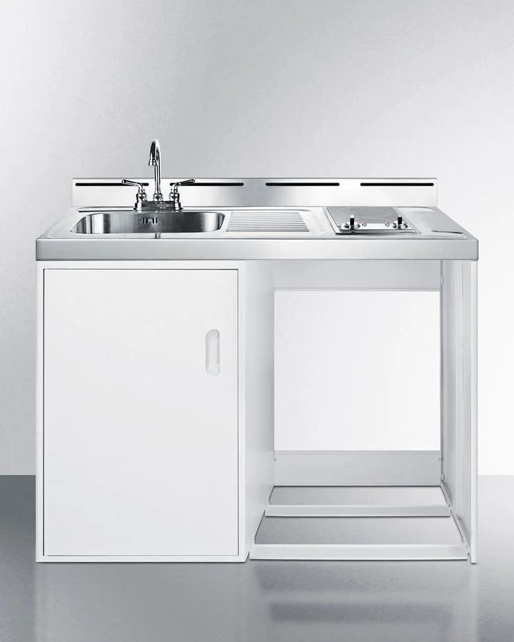 Includes a 2-burner cooktop, sink with faucet, storage cabinet, and opening to accept a 24" wide refrigerator or dishwasher (not included)