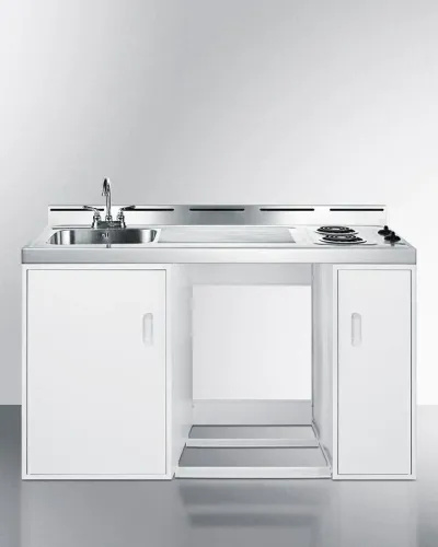 Includes a 2-burner cooktop, sink with faucet, storage cabinet, and opening to accept a 24" wide refrigerator or dishwasher (not included)